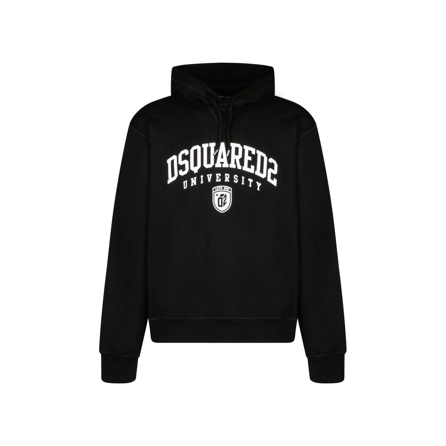 Dsquared2 Black University Cool Hoodie. Black cotton hoodie, contrasting logo print on the front, classic hood, long sleeves, ribbed hem.