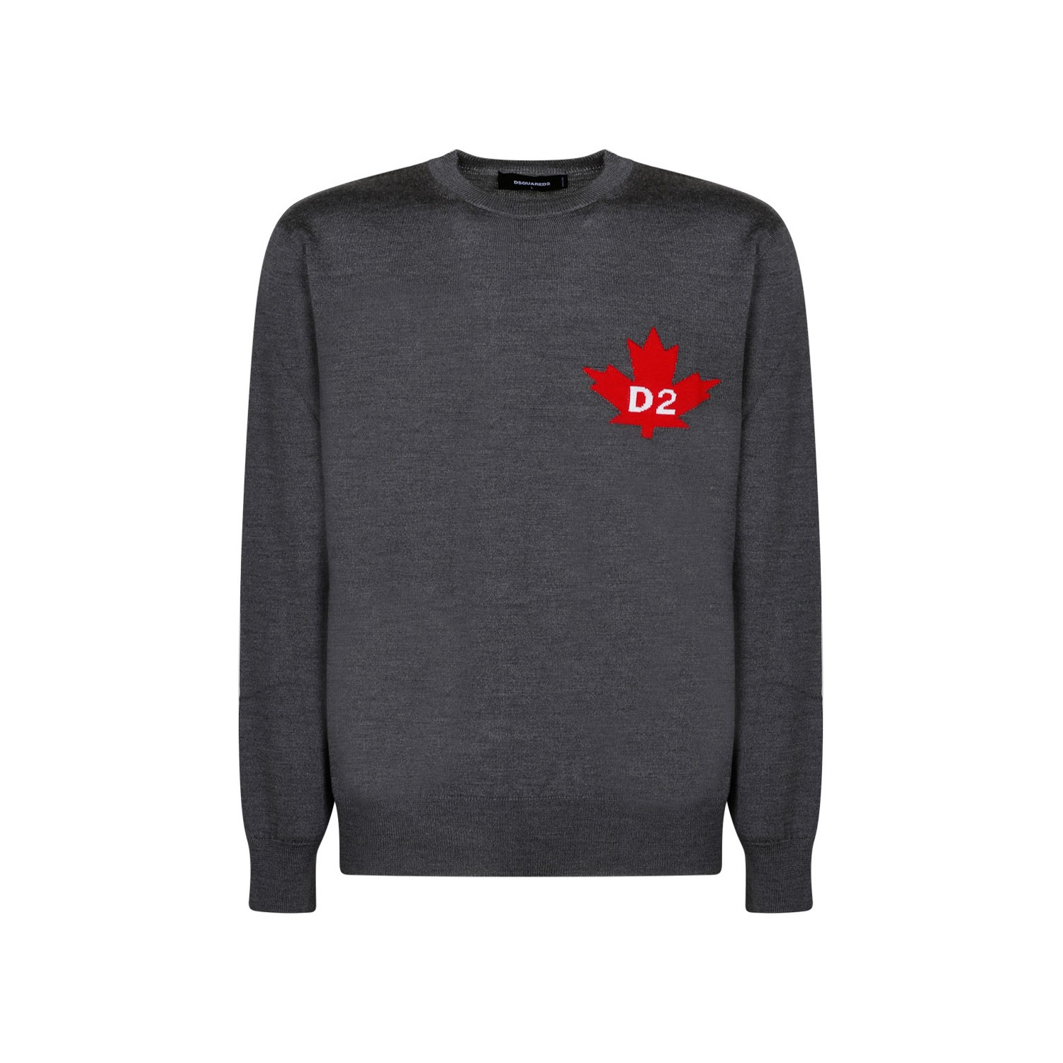Dsquared2 Dark Grey Sweater. Dark grey wool sweater, embroidered red maple leaf logo, crew neck, long sleeves and straight hem.