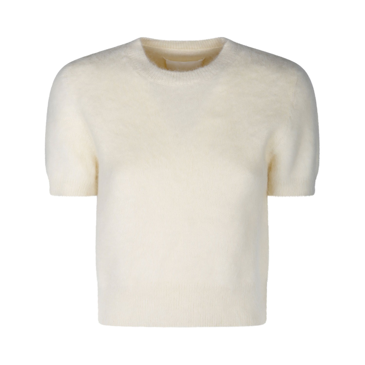 Maison Margiela Lemon Yellow Knitted Top. Lemon yellow alpaca wool blend top, pullover design, brushed finish, crew neck, short sleeves, cropped.