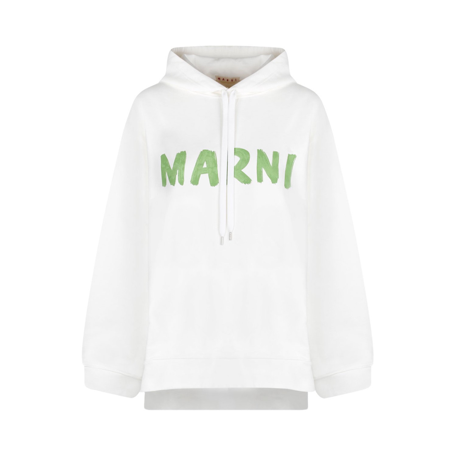 Marni White and Light Green Cotton Hoodie. White and light green and yellow cotton hoodie, jersey texture, logo print at the chest, drawstring hood, drop shoulder, long sleeves, high low hem.