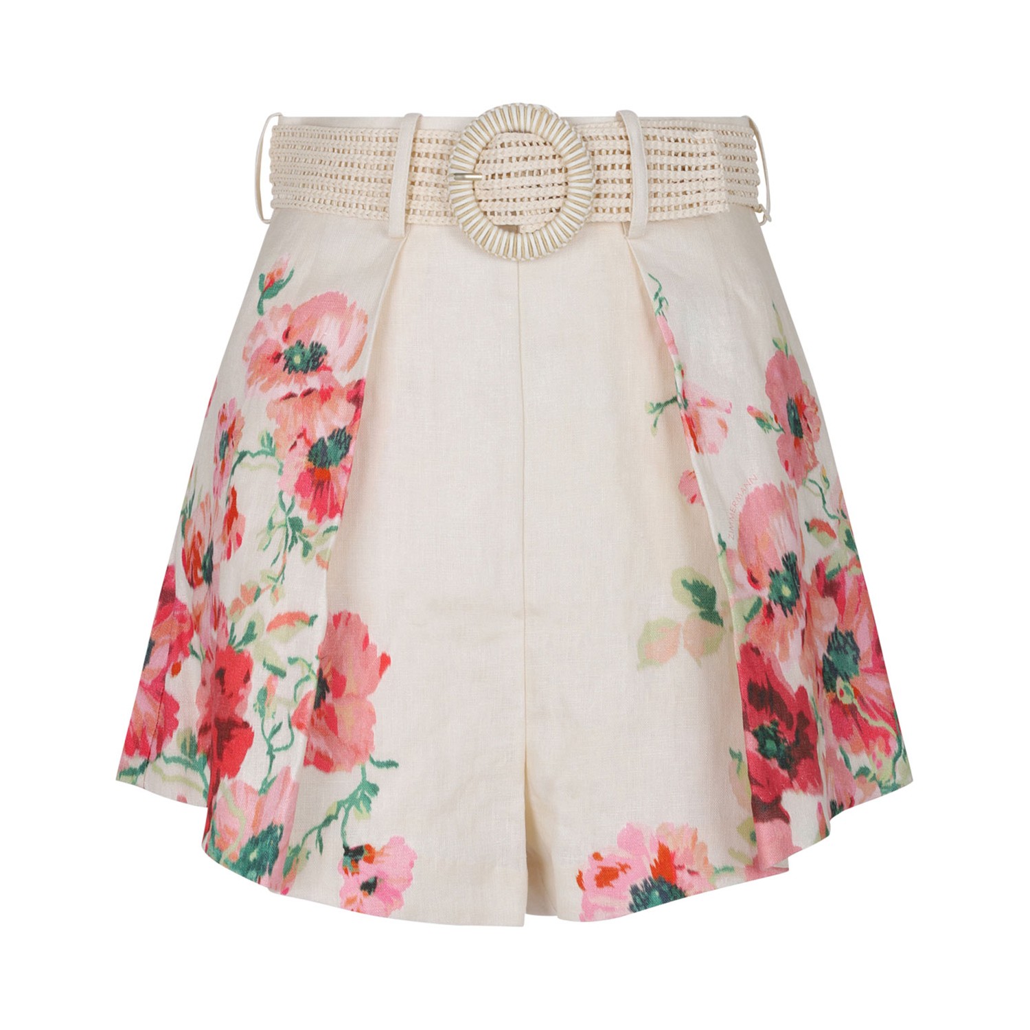 Zimmermann Lightburst Tuck Short. Cream, red and floral linen high waisted short, placement print throughout. Invisible zip at centre back, removable raffia buckle belt, deep tucks at front, lined.