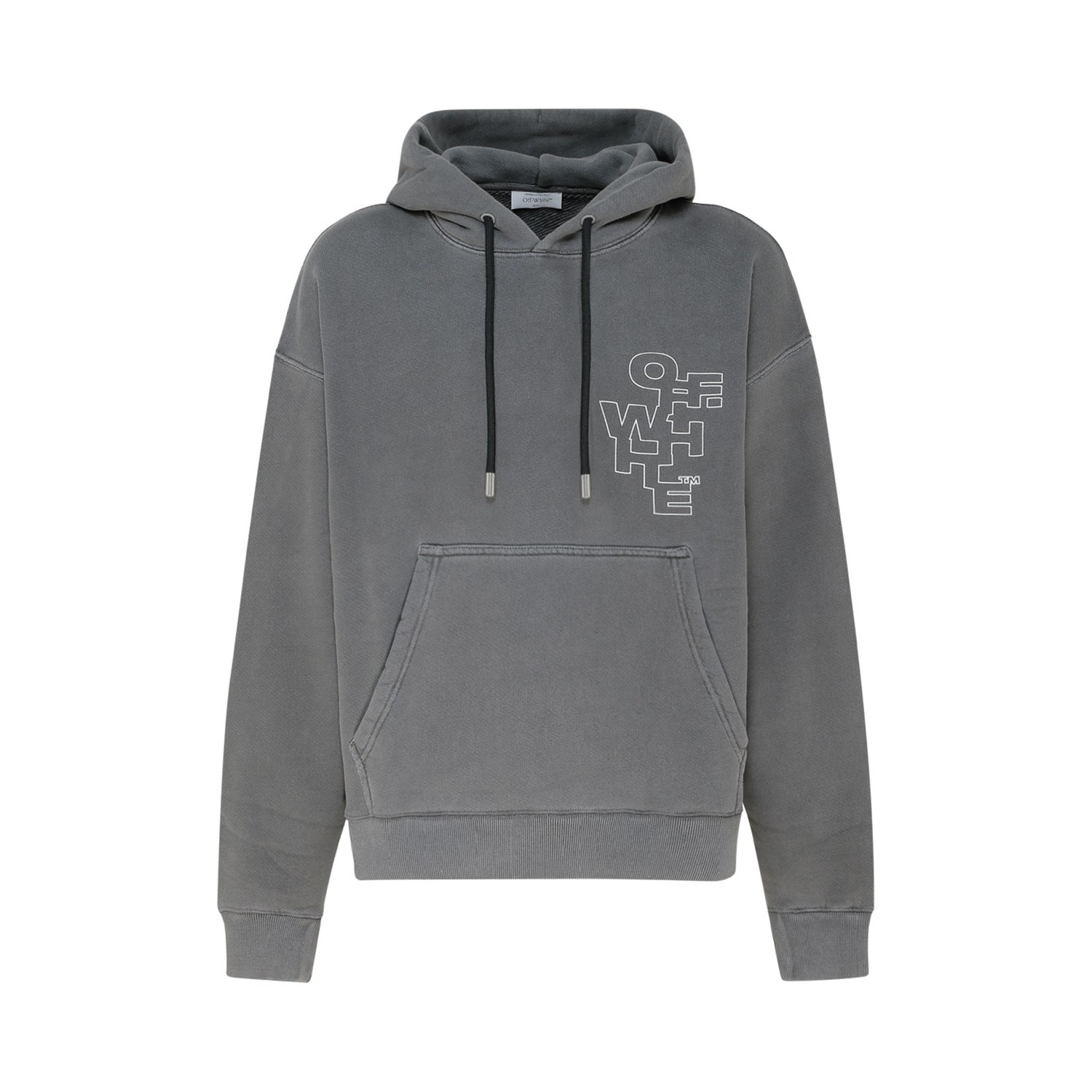 Off White Grey Arrows Hoodie. Grey cotton hoodie, jersey texture, logo print at the chest. Signature Arrows motif to the rear, drawstring hoos, long sleeves, ribbed cuffs and hem. Front pouch pocket and straight hem.