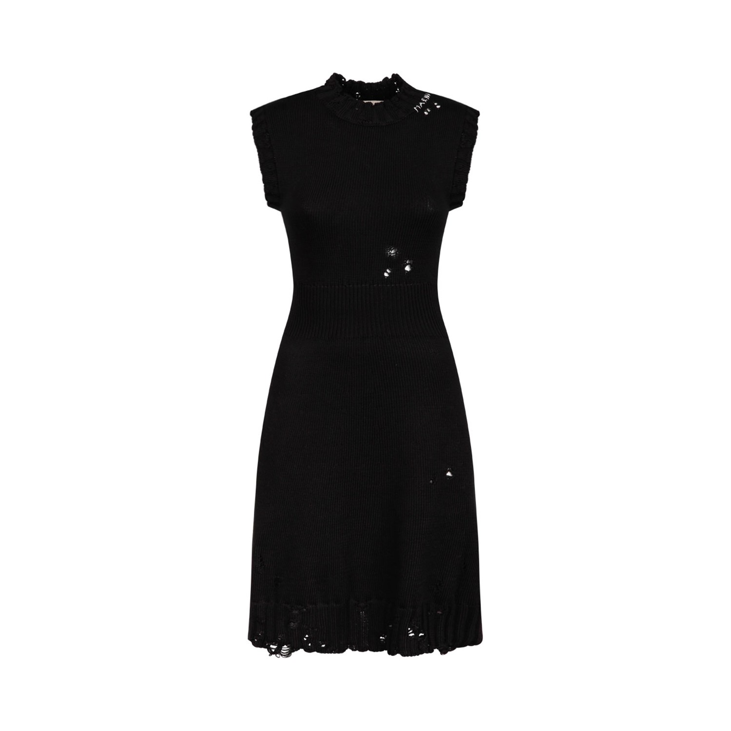 Marni Black Dishevelled Knitted Dress. Black knitted crew-neck cotton midi dress, distressed along the edges for a dishevelled look. Regular fit with cinched waist and cap sleeves. Hand-stitched Marni mending logo with flower detail.