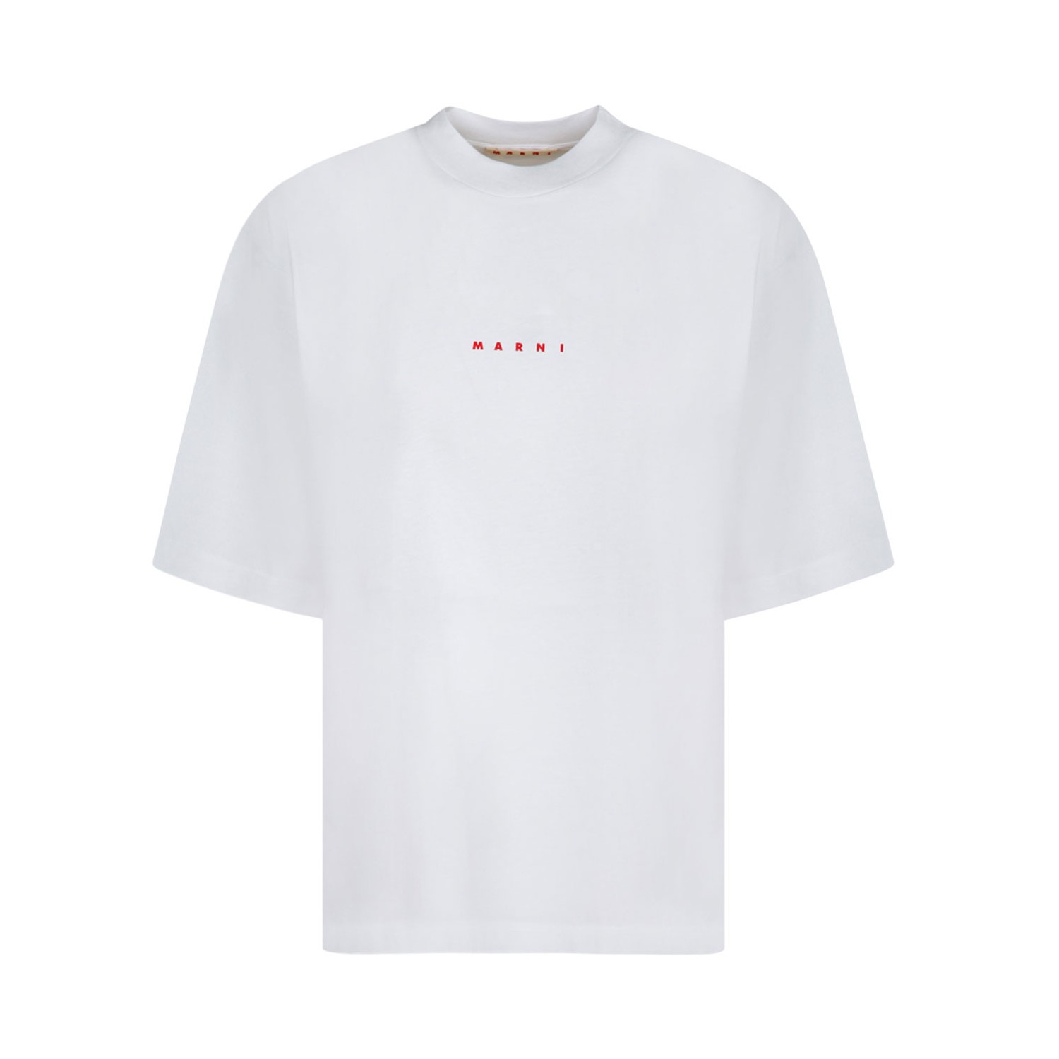 Marni White Logo Print T-Shirt. White crew-neck t-shirt made from organic cotton jersey. Loose fit with ribbed neck and slightly dropped sleeves. Small Marni logo printed on the chest.