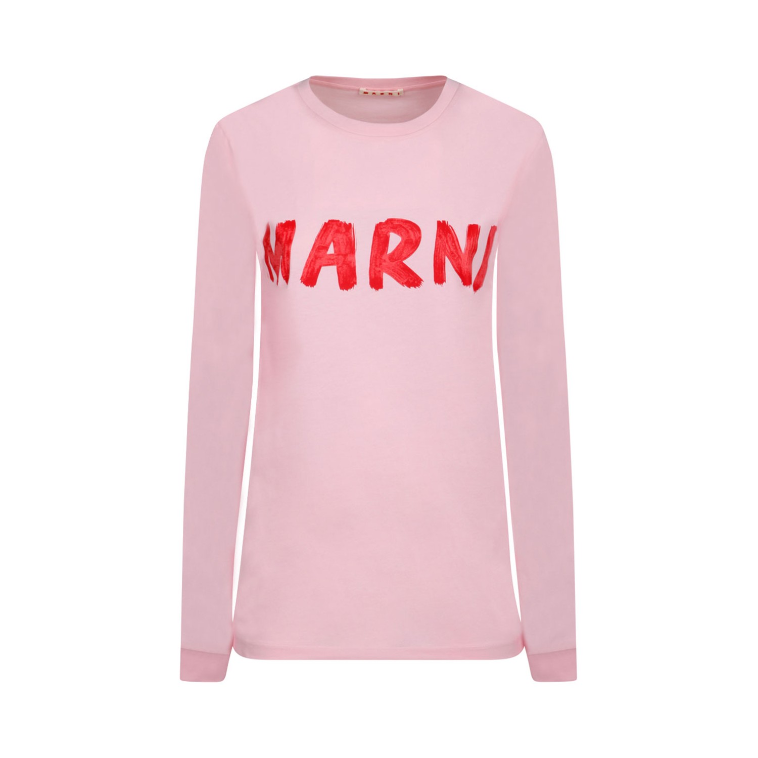 Marni Pink Logo Print T-Shirt. Pink cotton jersey T-shirt with front Marni print, crew neck and long sleeves, perfect for mid-seasons. The T-shirt has a regular fit.