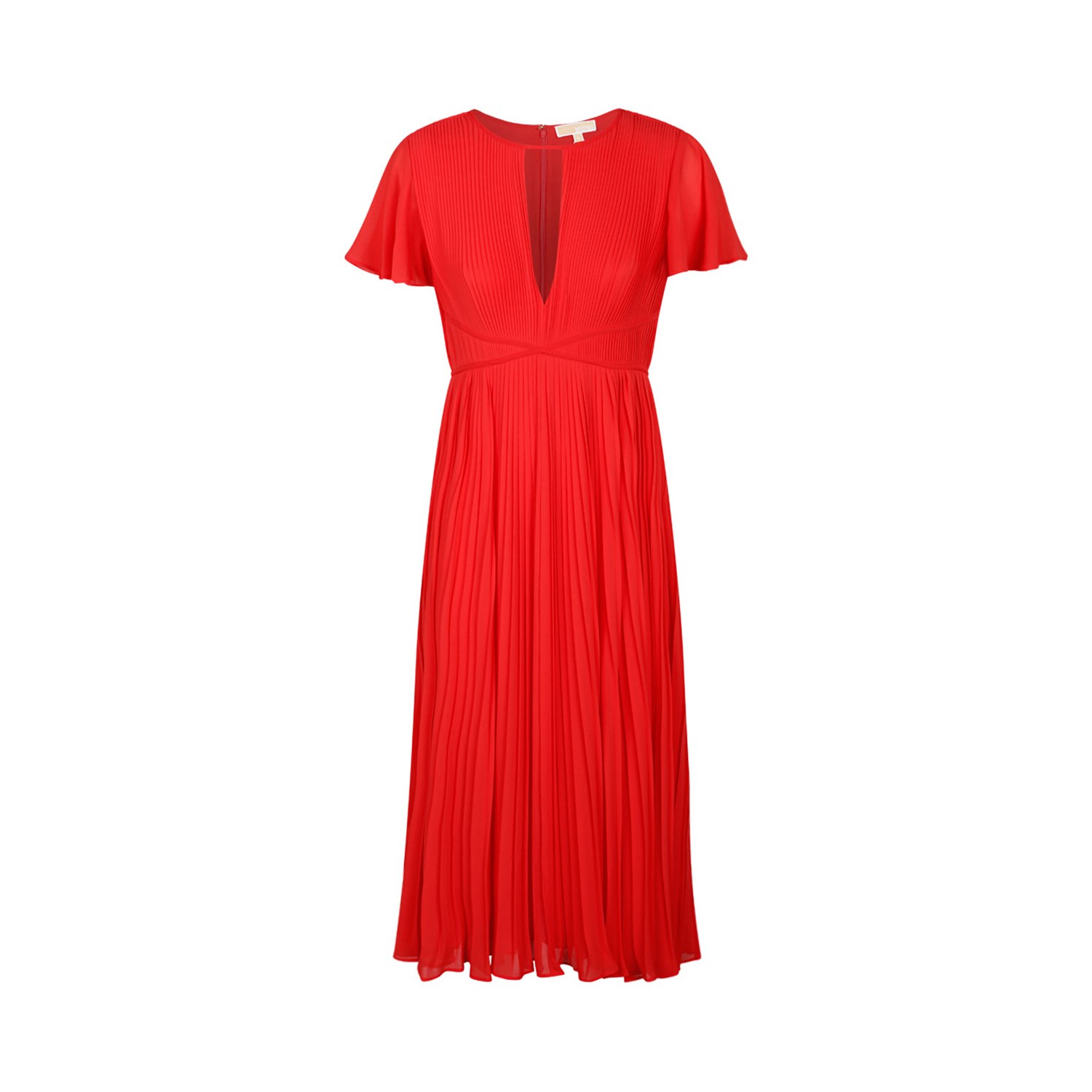 Michael Kors Sea Coral Longuette Dress made of georgette, with soft pleats. Fluffy silhouette with floaty short sleeves and fitted bodice. Short sleeves.