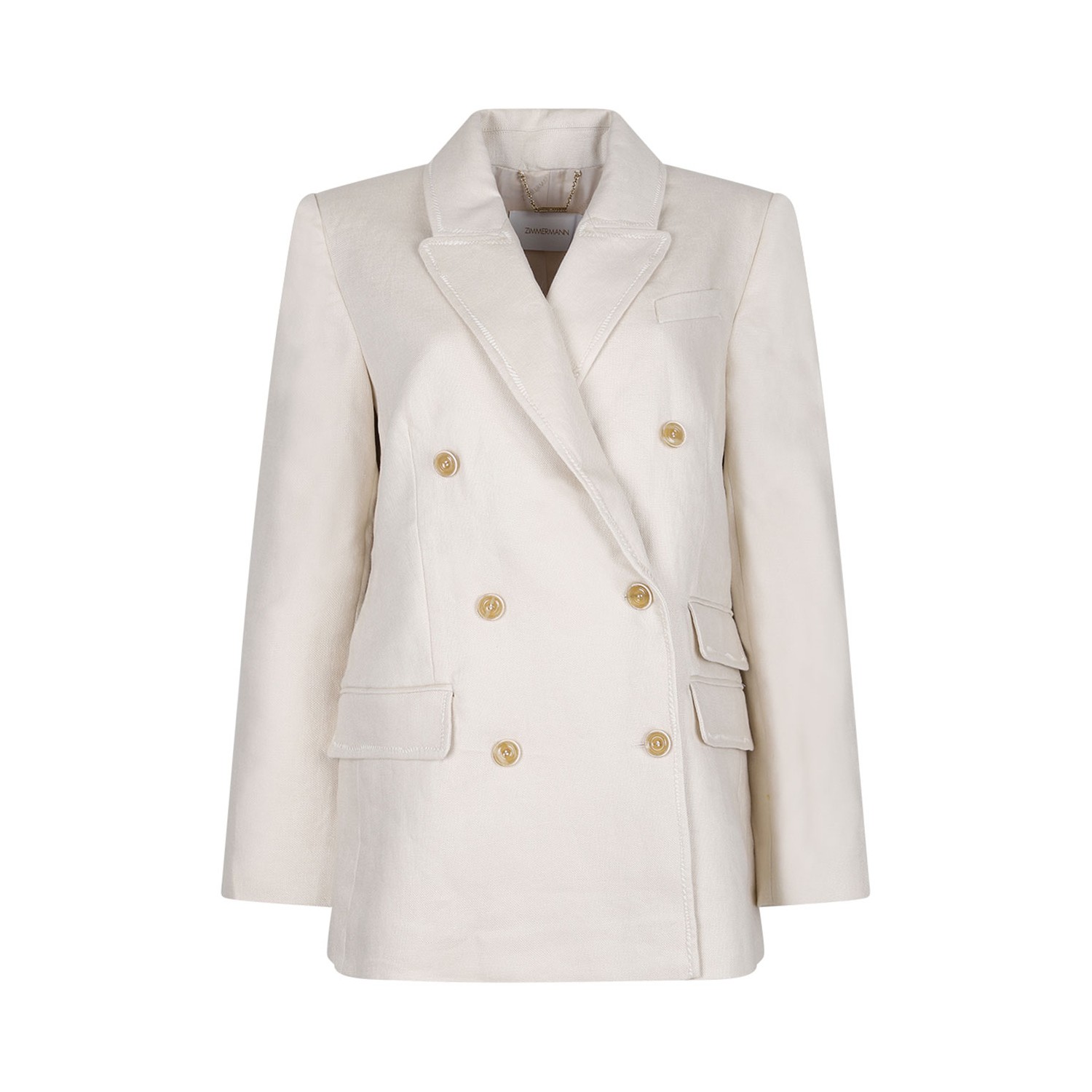 Zimmermann Matchmaker Tailored Blazer. Ecru linen and flax blazer, tailored cut, decorative stitching. Peak lapels, chest welt pocket, long sleeves. Buttoned cuffs, three side flap pockets, English rear vents, logo jacquard lining. Double breasted button fastening.
