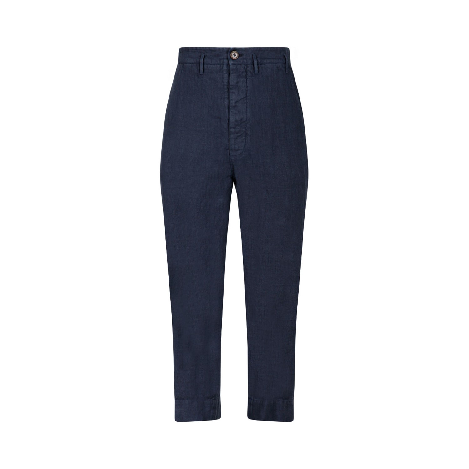 Vivienne Westwood Dyed Linen Cropped Cruise Trousers with tone-on-tone stitching. Belt loops and amber button fastening, welt pockets.