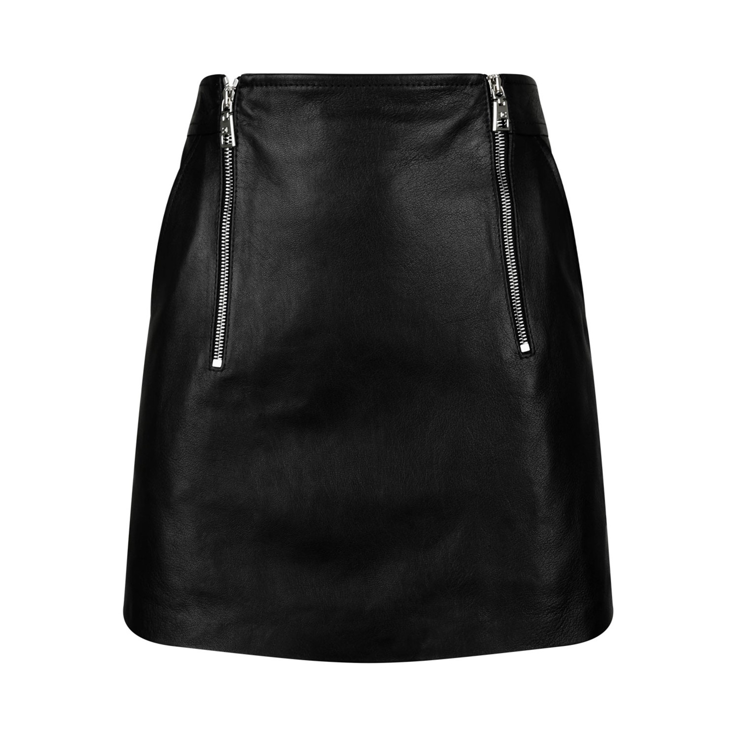 Elisabetta Franchi Black Leather Mini Skirt with double silver front zipper at regular waist. Two welt pockets on the side.