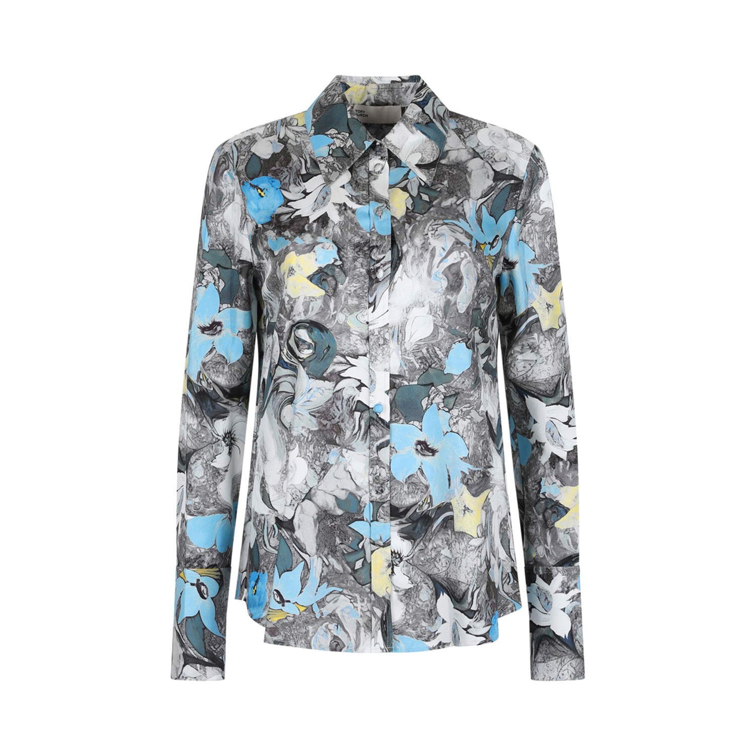 Tory Burch Floral Print Shirt. Cobal blue silk twill weave shirt, all over floral print, front button fastening. Straight point collar, long sleeves, buttoned cuffs, straight hem.
