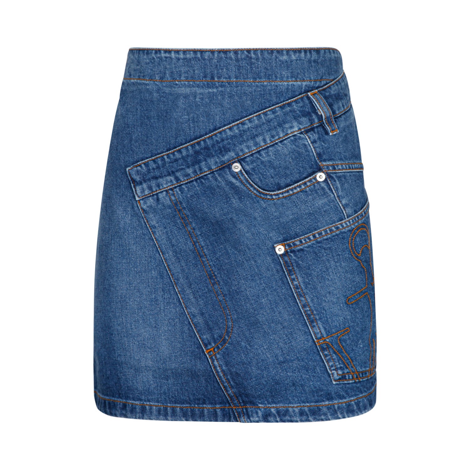 JW Anderson Denim Mini Skirt. Denim mini skirt, patchwork construction, hazelnut leather application embossed JW Anderson logo. Tone on tone stitching, side patch pocket with anchor stitching, side closure with silver colored zip, silver colored metal components.
