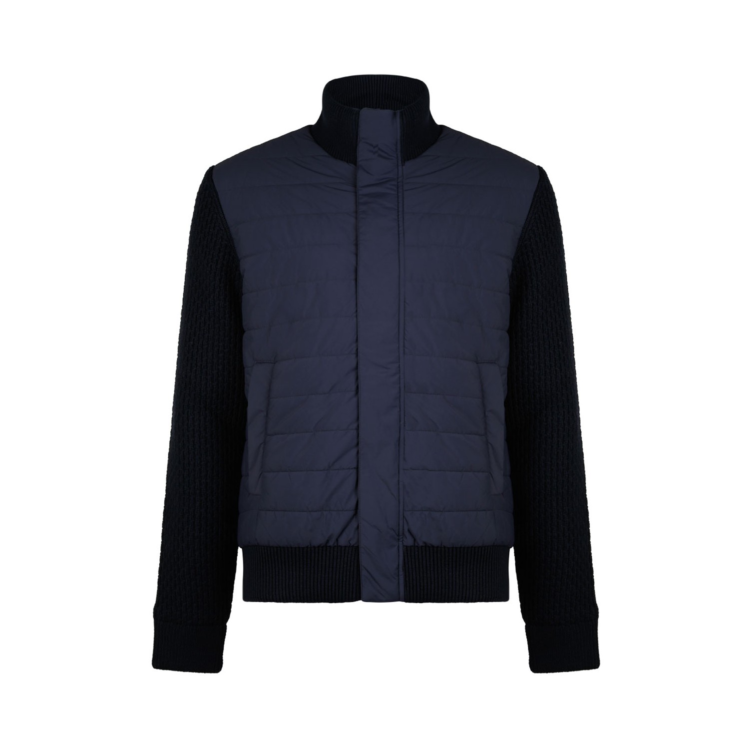 Herno Quilted Inserts Navy Blue Jacket. Navy blue jacket made of virgin wool with quilted inserts. Ribbed trim, high collar and long sleeves. Two side pockets with snap button and front fastening with snap button and zip.