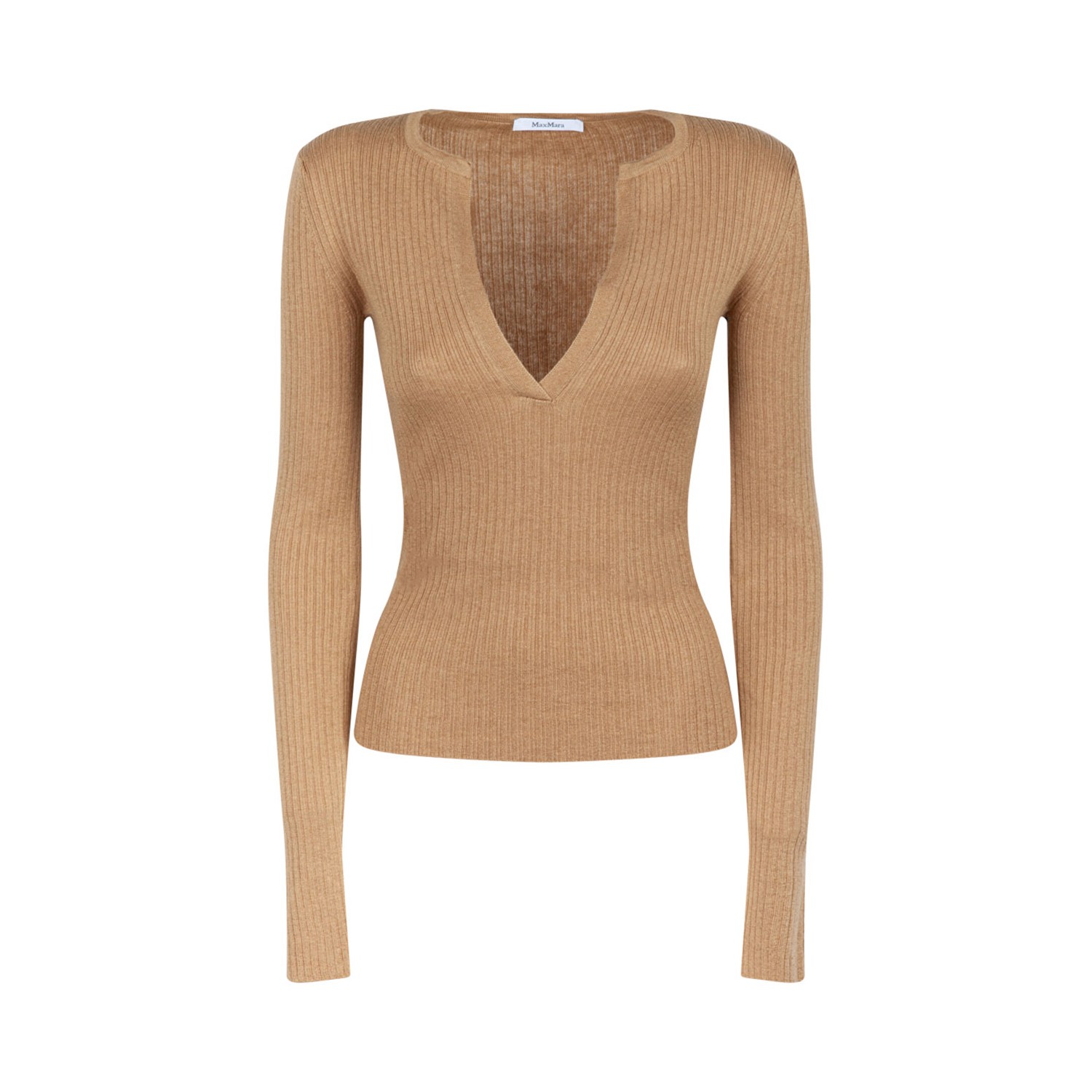 Max Mara Camel Brown Sweater. Camel brown long-sleeved sweater, made of lightweight and fine cashmere and silk yarn. The fine ribbed knit highlights the fitted silhouette, with a crew neck and deep V-shaped motif on the front.