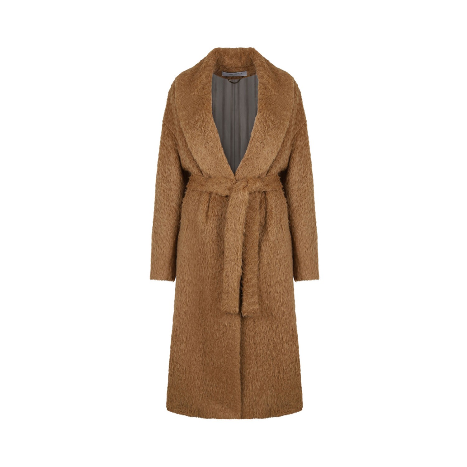 Golden Goose Tobacco Brown Shawl Collar Coat. Tobacco Brown Coat made of heavy wool with shawl collar. Belted waist and covered button fastening. Two pockets on the front and two slits on the back. Viscose jacquard lining with logo. Double star on the back. Fit over.