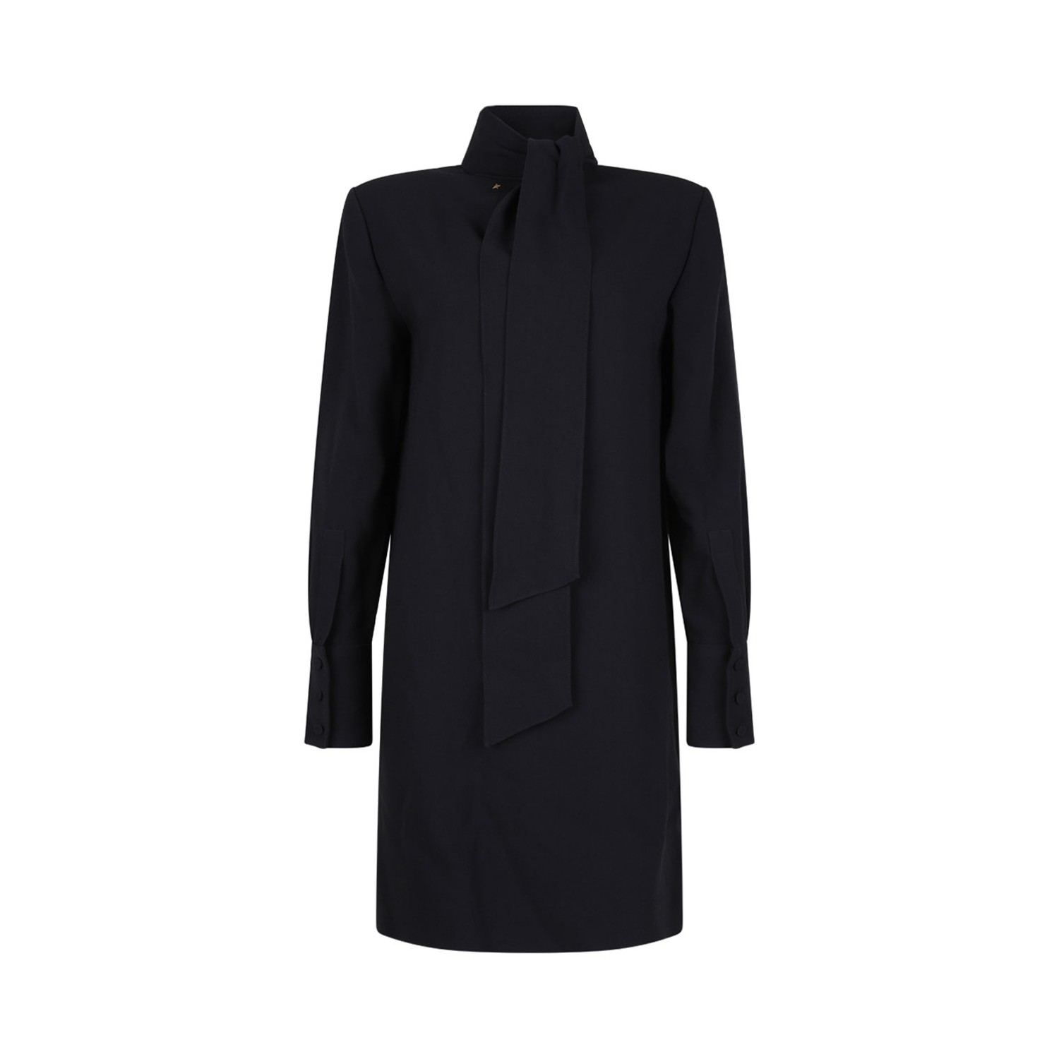 Golden Goose Black Bow Dress. Black wool dress, long sleeves, high neck with a decorative bow on the front, wide cuffs embellished with buttons.