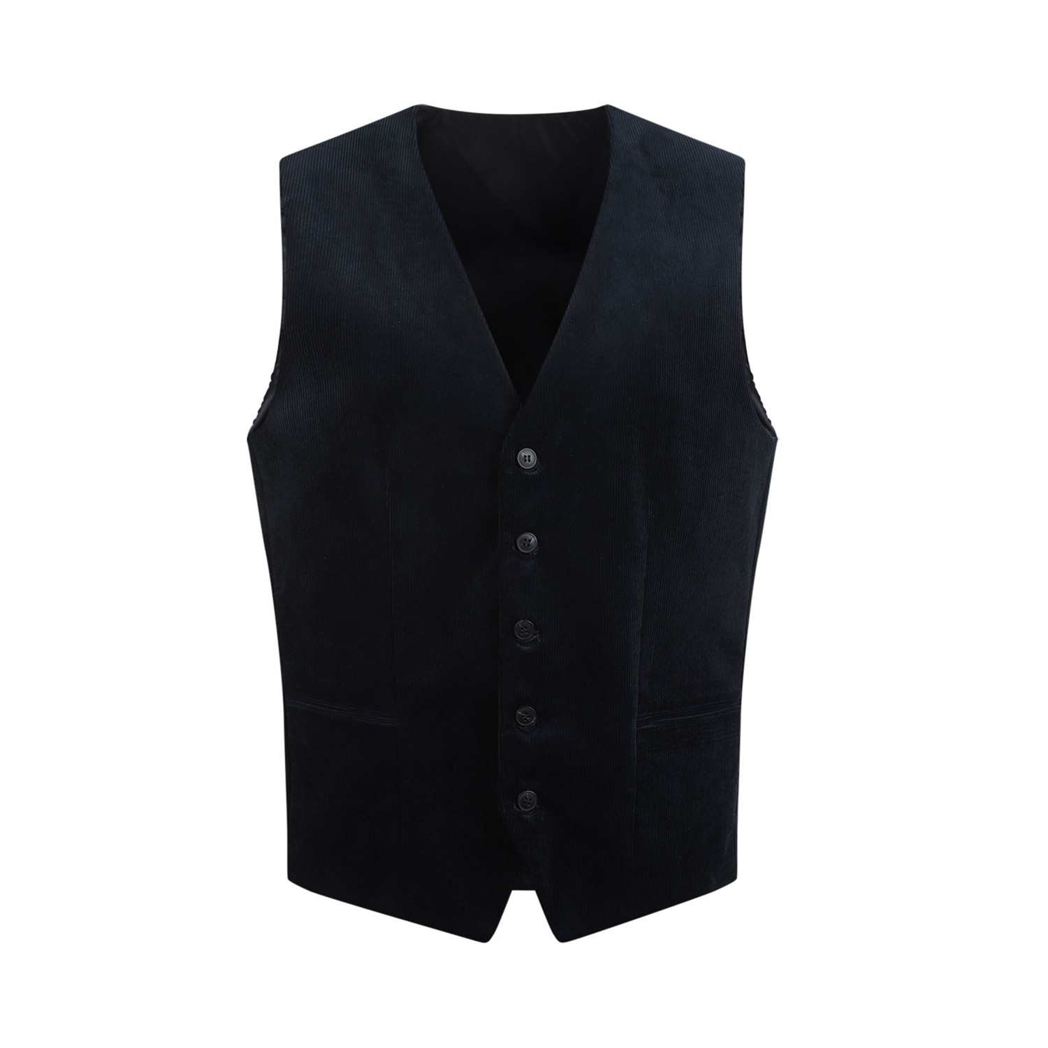 Selected Navy Blue Corduroy Waistcoat. Navy blue corduroy waistcoat is made with fabric, V neck, button up front, jetted front pockets. Fully lined, regular fit.