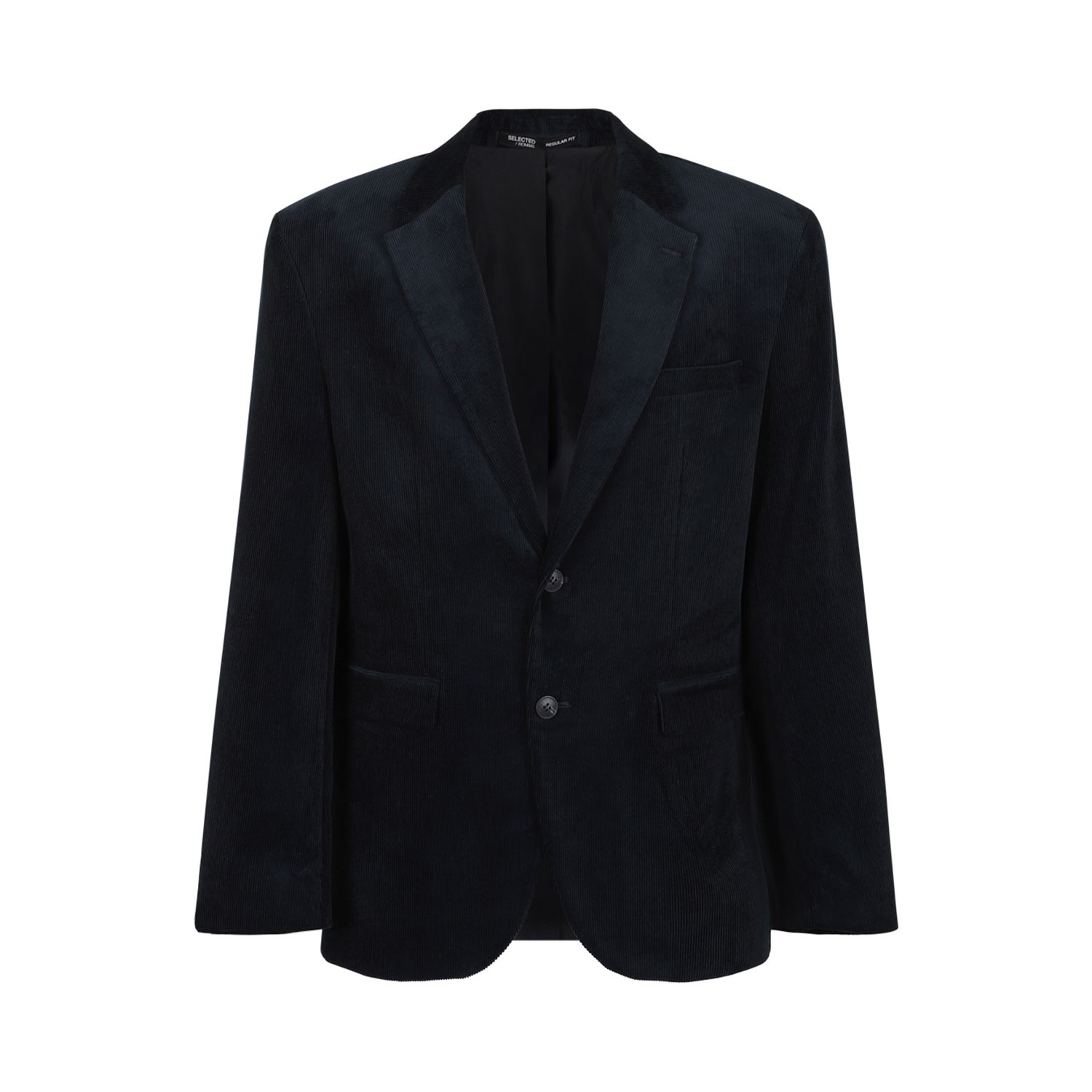 Selected Navy Blue Corduroy Blazer. Navy blue corduroy blazer made with fabric, single breasted, notch lapel with buttonhole detail, long sleeves with buttoned cuffs. Welted chest pocket, jetted front pockets with flaps, double vents.
