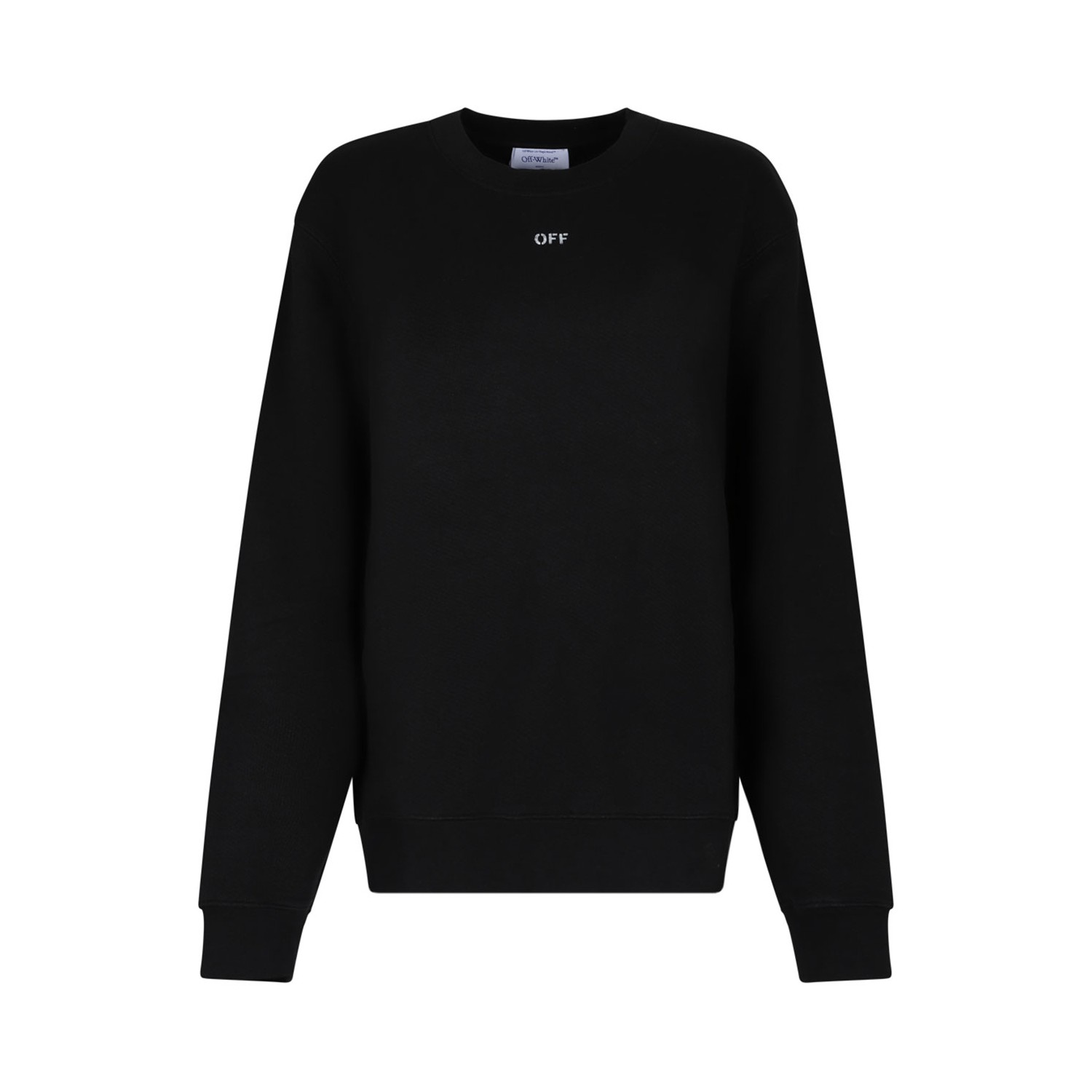 Off White Black Arrows Embroidered Sweatshirt. Black cotton sweatshirt, jersey texture, crew neck, long sleeves. Logo print at the chest, signature Arrows motif, ribbed trim, straight hem and French terry lining.