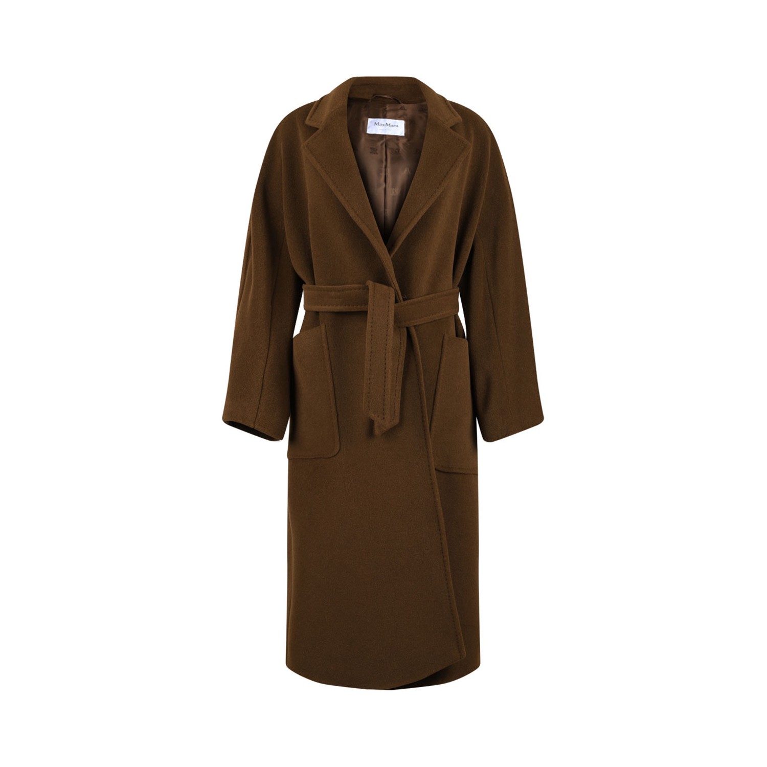 Max Mara Brown Long Coat. Brown long coat, lined with a lapel collar, long kimono sleeves and front patch pockets. Finished with a central vent on the back. The matching belt fastening accentuates the silhouette.