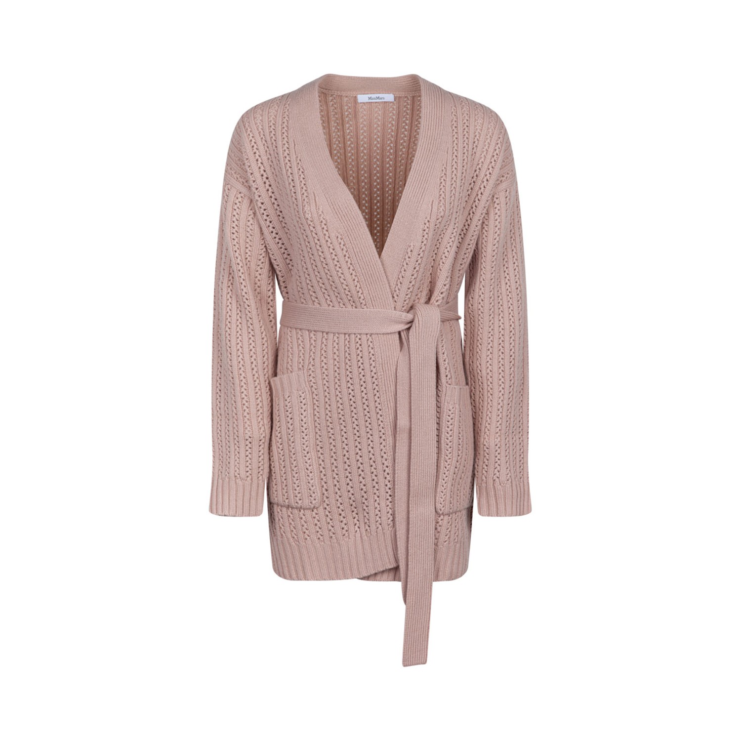 Max Mara Light Pink Balzac Cardigan. Cardigan with a robe silhouette, made of fine wool and cashmere yarn worked with an openwork rib. Model with a slightly oversized volume, with a V-neck, long low set sleeves and patch pockets on the front. The matching belt closure allows you to highlight the waistline.