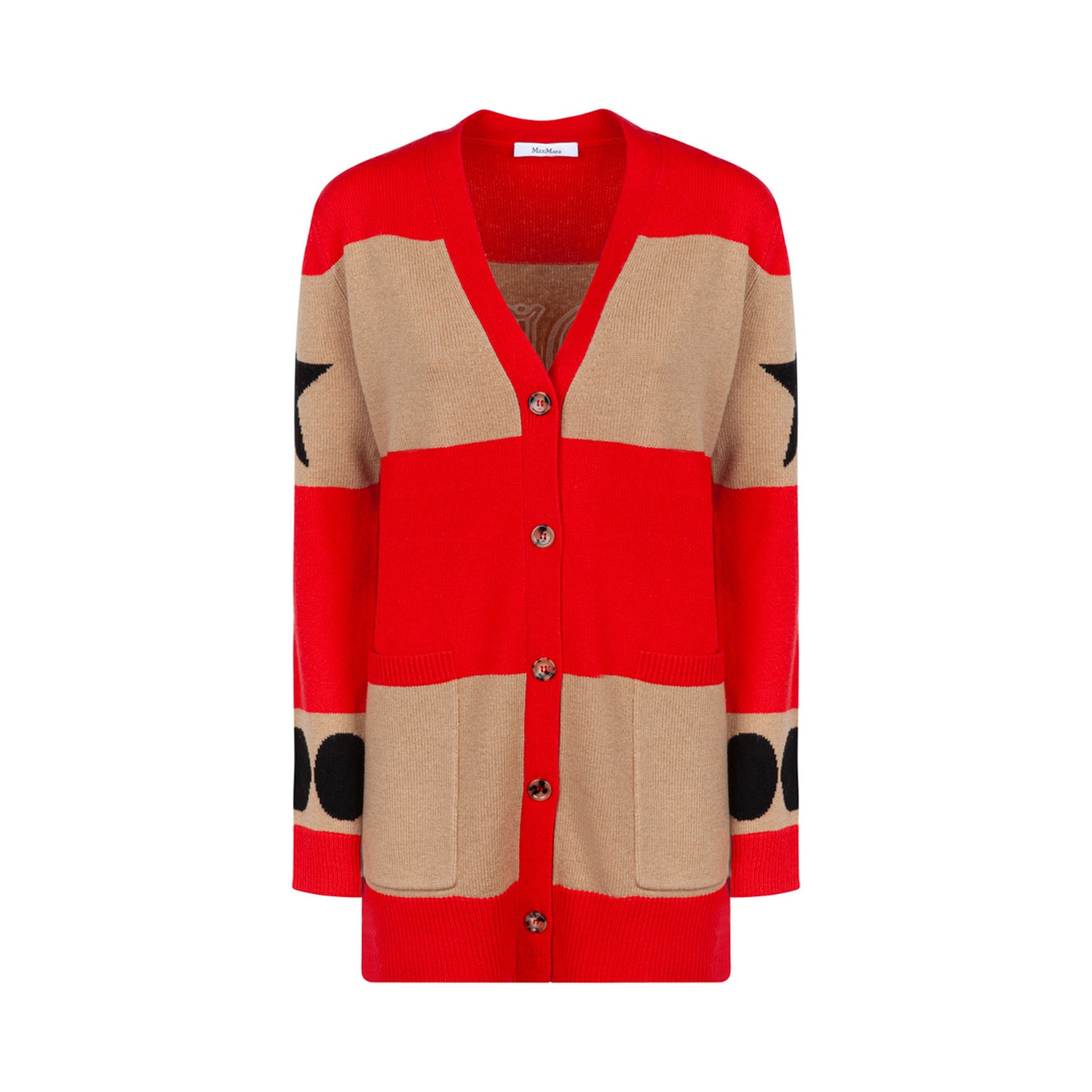 Max Mara Red Valido Cardigan. Long cardigan with oversized volume, made of a fine blend of wool and cashmere in plain stitch. The model is personalized with jacquard stripes, placed designs and contrasting 1951 detail, with a characteristic flocked texture, applied on the back. Complete with patch pockets on the front, V-neck and ribbed edges. Front closure with visible buttons.