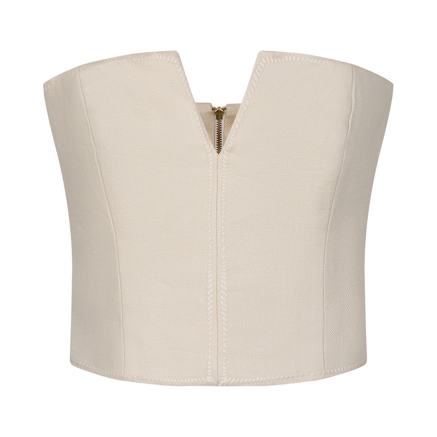 Zimmermann Matchmaker Bustier Top. Light beige linen bustier top, zig-zag topstitching, boned bodice. V neck, strapless, concealed rear zip fastening, straight hem, cropped.