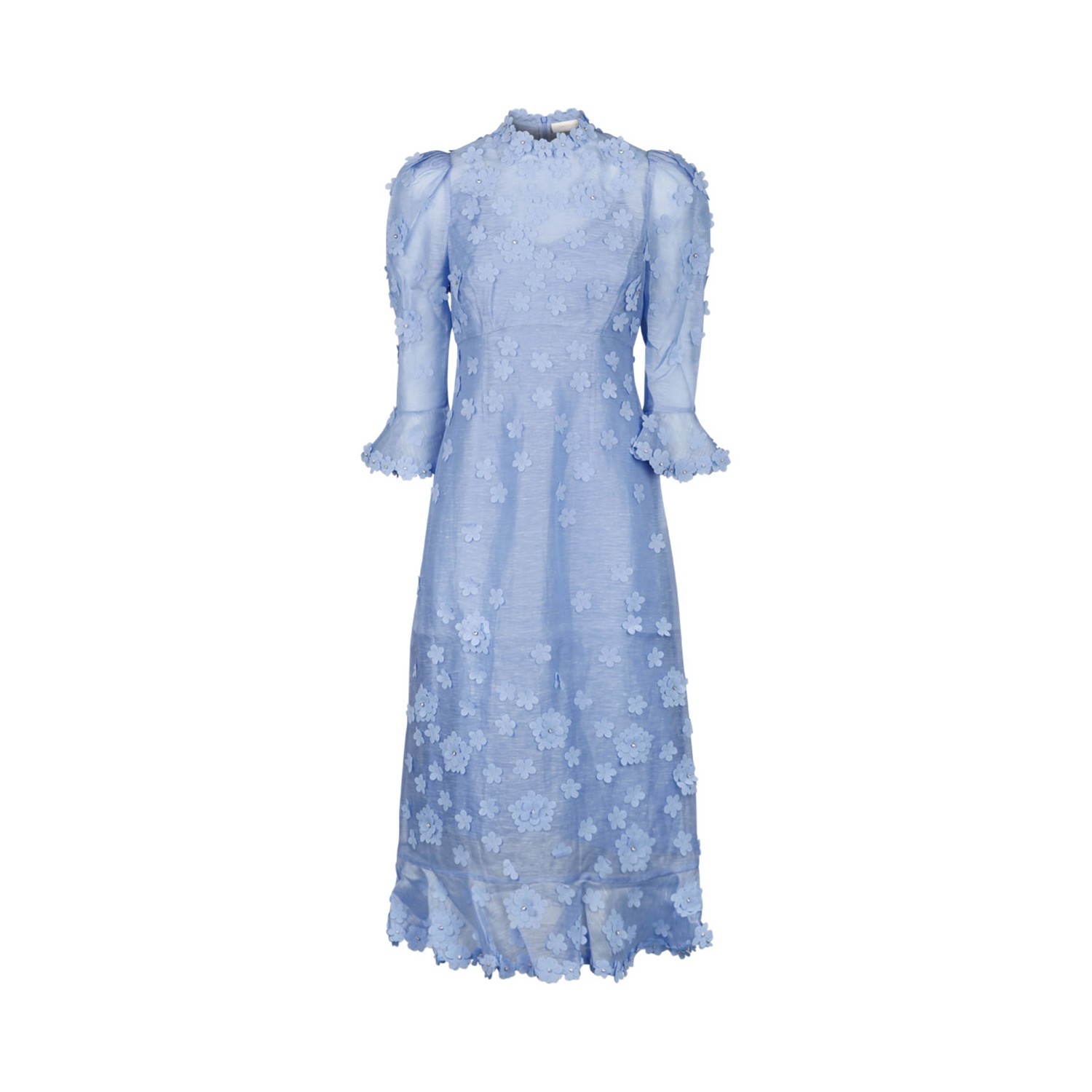 Zimmermann Matchmaker Lift Off Midi in jacaranda colour featuring a flower trim and frills on hem. Long sleeves. invisible zip at centre back and separate slip.