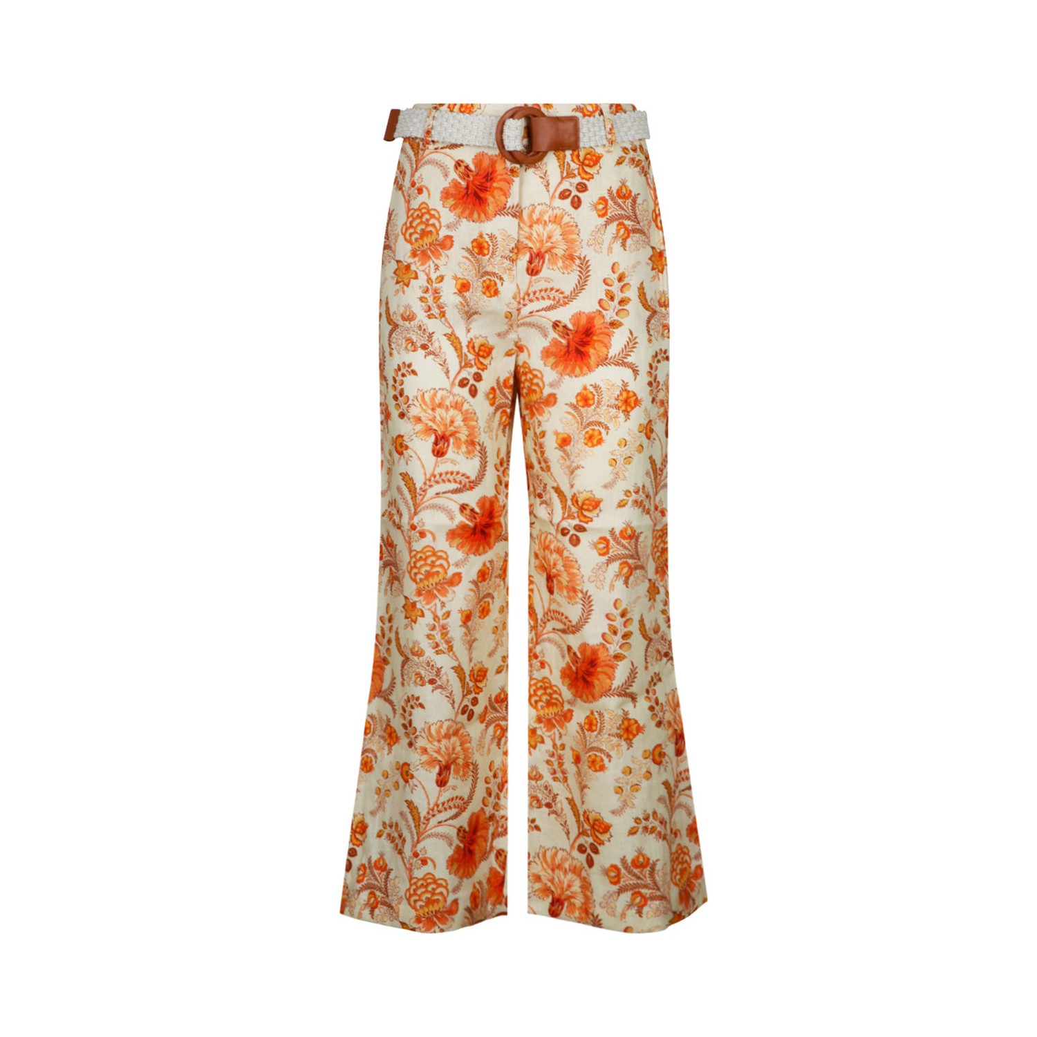 Zimmermann Light Beige and Orange Junie Trousers. Light beige and orange linen trousers, all over floral print, high waisted, belted waist, two side slit pockets. Two rear welt pockets, wide leg, cropped leg.