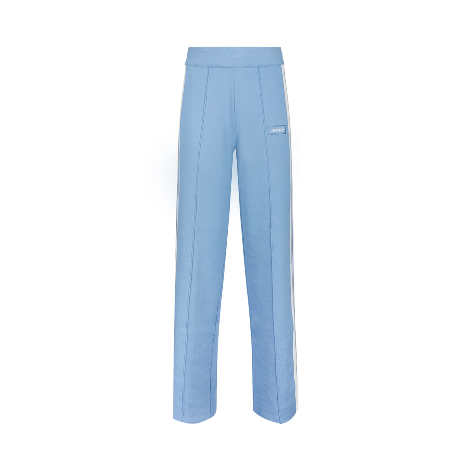 Autry Light Blue Knitted Trousers with elasticated waist and white side bands. Contrasting embroidered logo patch on the side. Straight cut with side openings at the bottom.