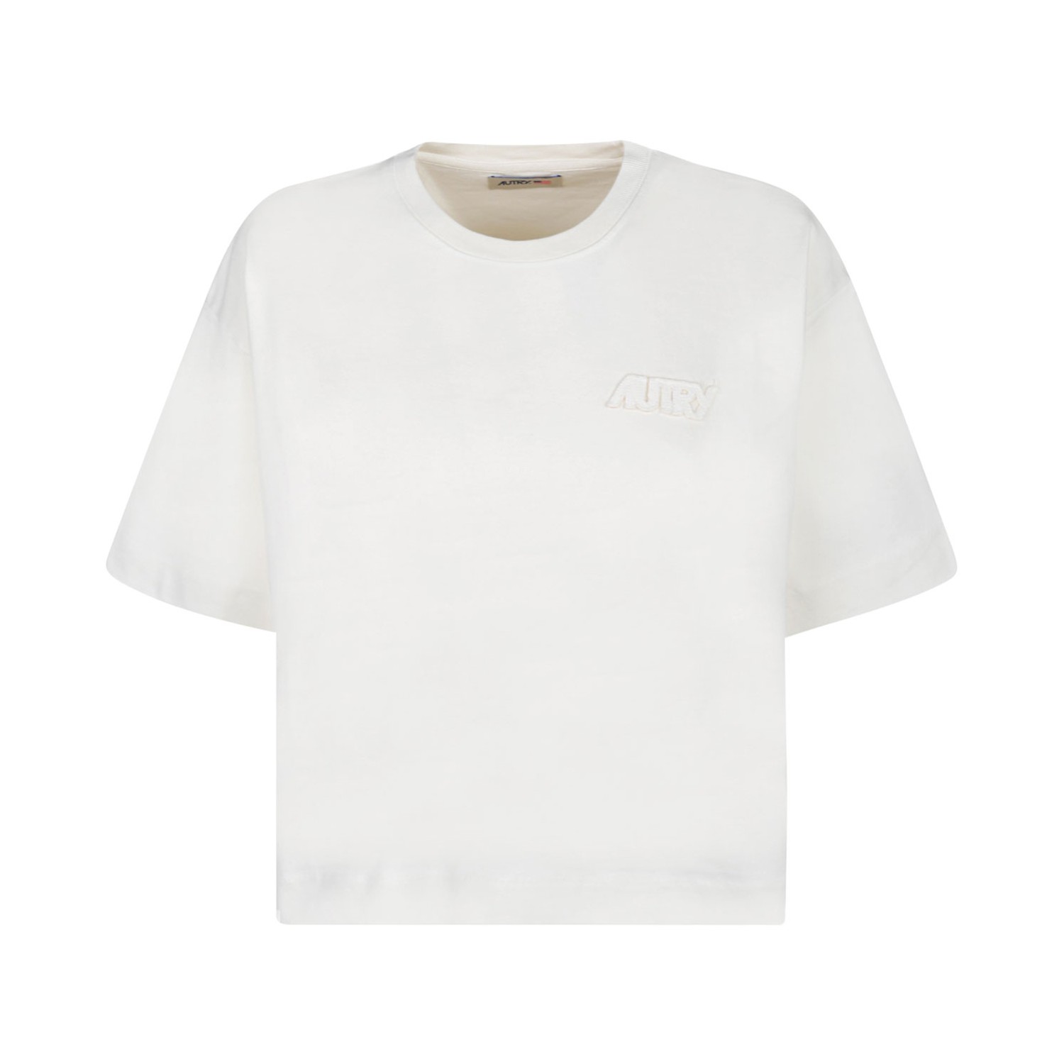 Autry Apparel Cream Cropped T-Shirt with crew neck in heavy cotton. Ribbed collar and short sleeves. Logo embossed on the front.