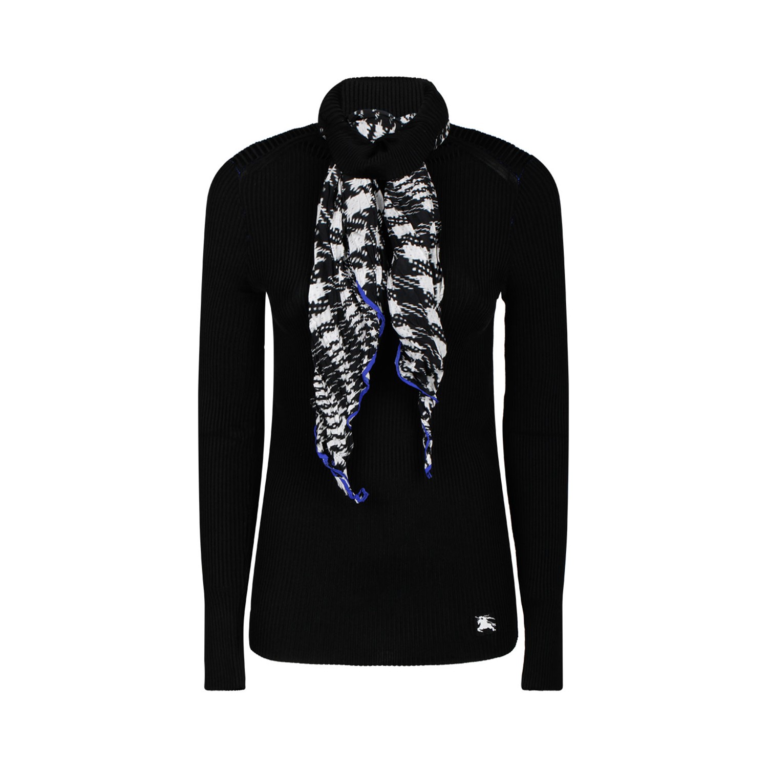 Burberry Scarf Rib Knit Sweater. Black turtleneck sweater in a rib-knit viscose blend, detachable silk scarf, Equestrian Knight Design at hem.