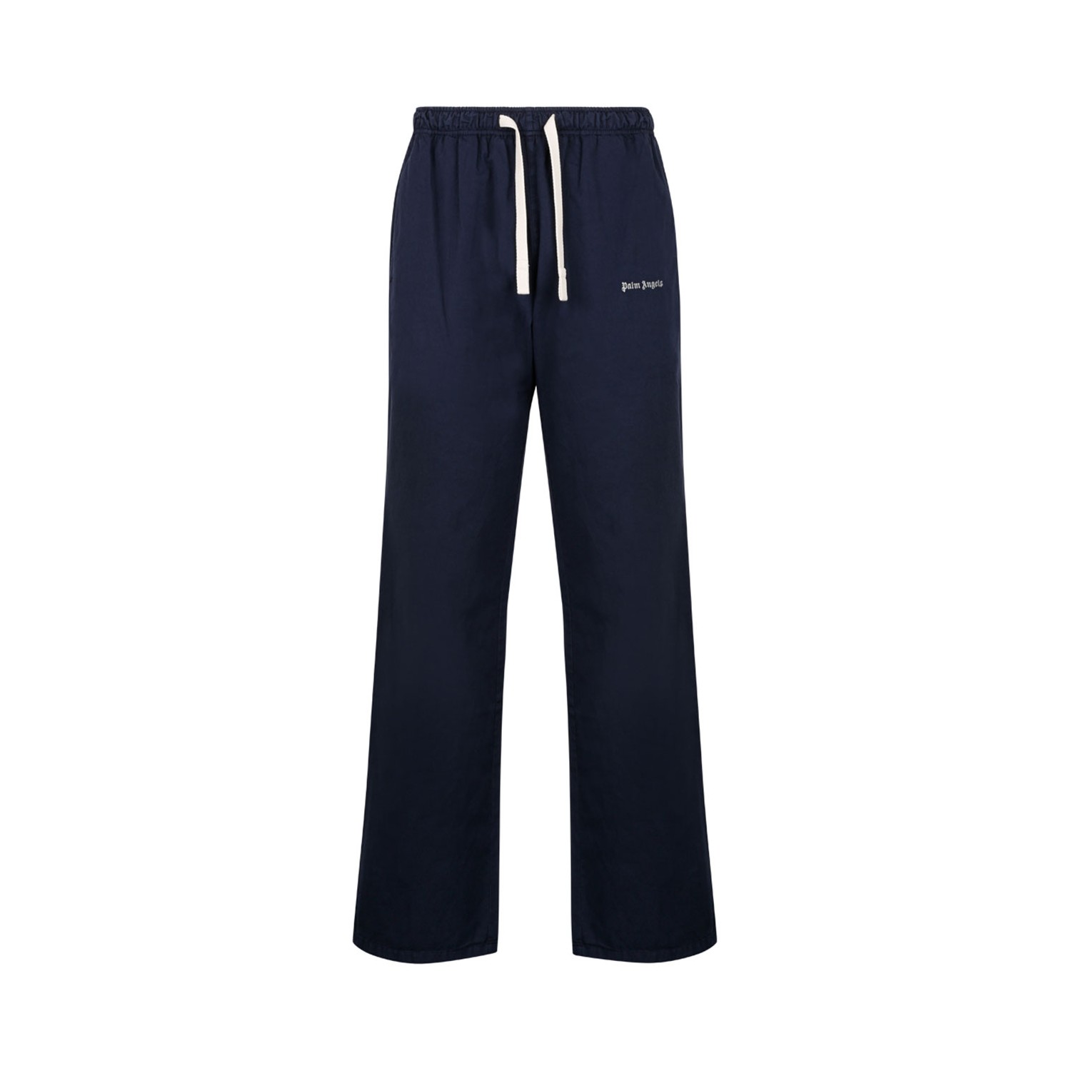 Palm Angels Navy Blue Trousers. Navy blue trousers with embroidered logo on the left leg. Elasticated waistband with contrasting drawstring, two side welt pockets and buttoned back pockets.