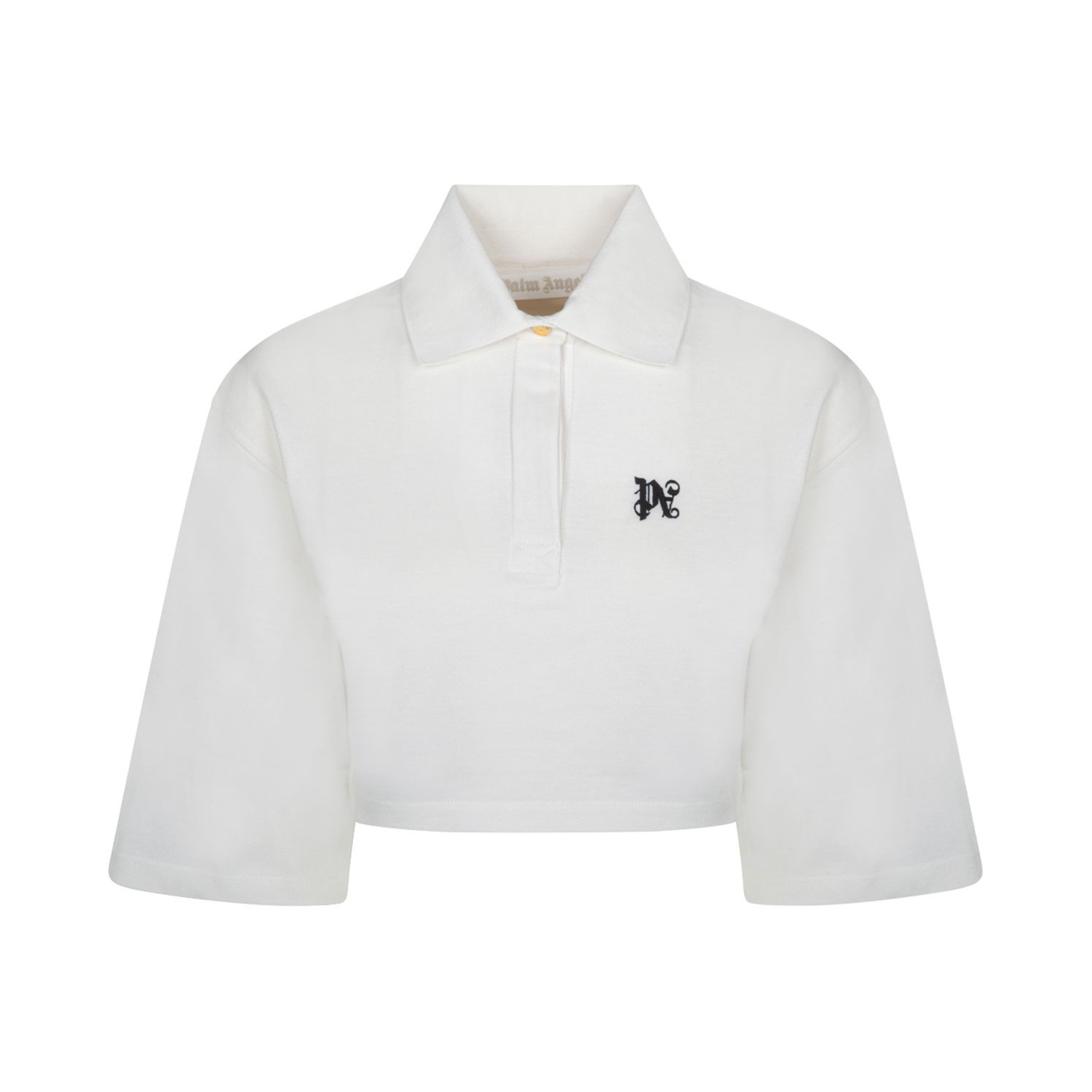 Palm Angels White Cropped Polo Shirt. White cotton polo shirt, logo print at the chest, polo collar, front button placket. Half length sleeves, cropped.