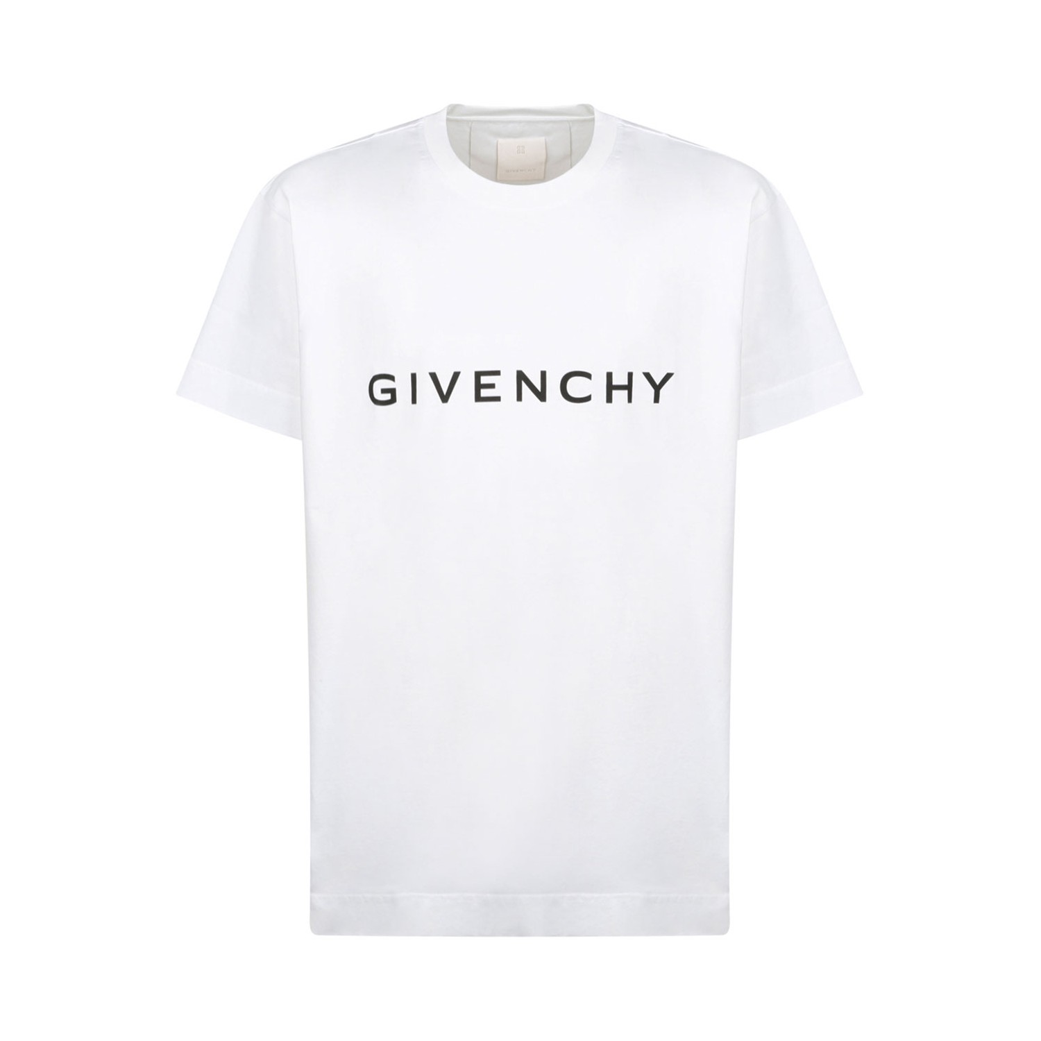 Givenchy White Archetype T-Shirt. White cotton t-shirt, short sleeves, crew neck, Archetype line. Givenchy signature printed on the front, small 4G logo printed on the back at the bottom, oversized cut.