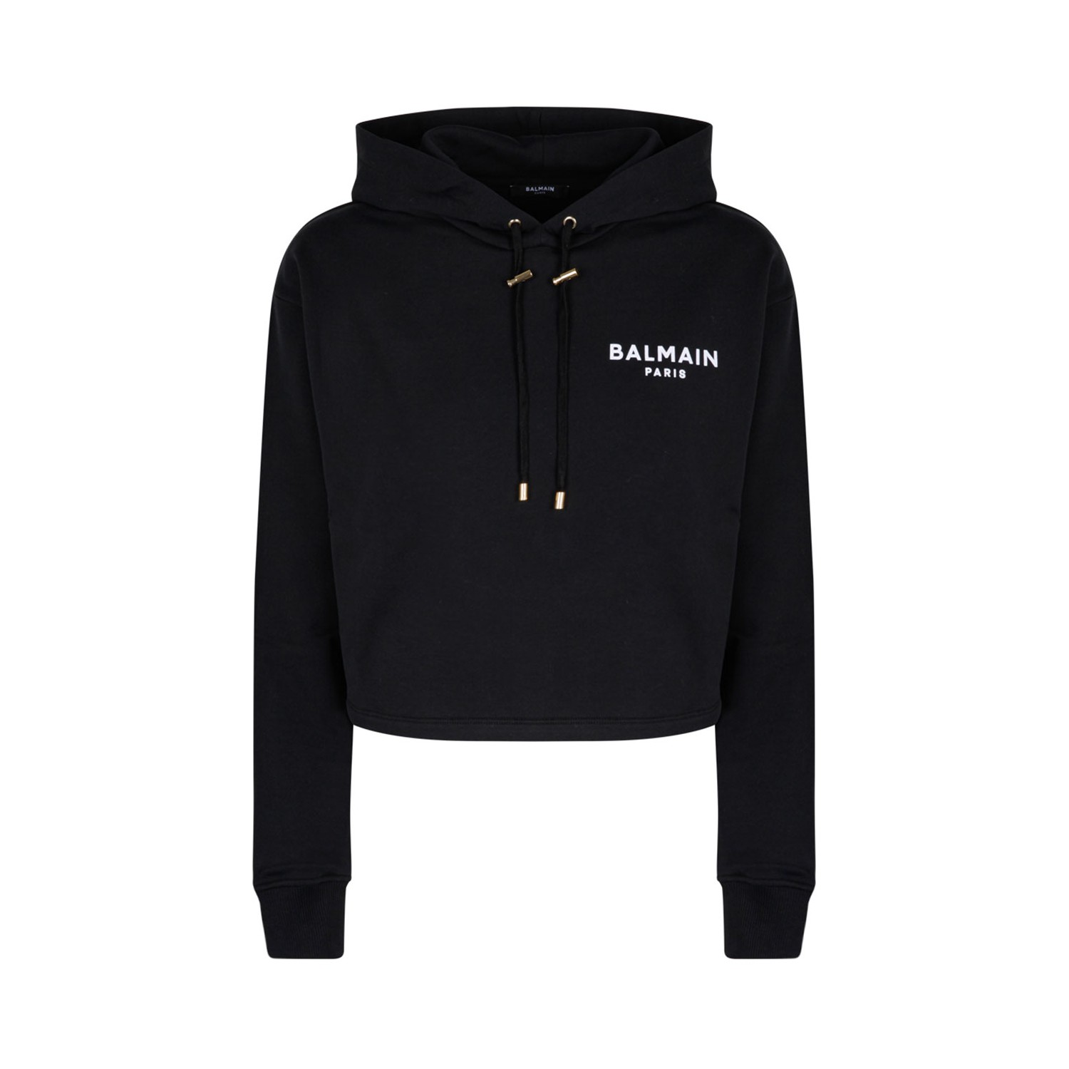 Balmain Black Logo Print Hoodie. Black cotton hoodie, contrasting flocked Balmain Paris logo on the front, round neck, long sleeves, drawstring adjustable hood. Golden metal ends, stoppers and eyelets, ribbed trim.