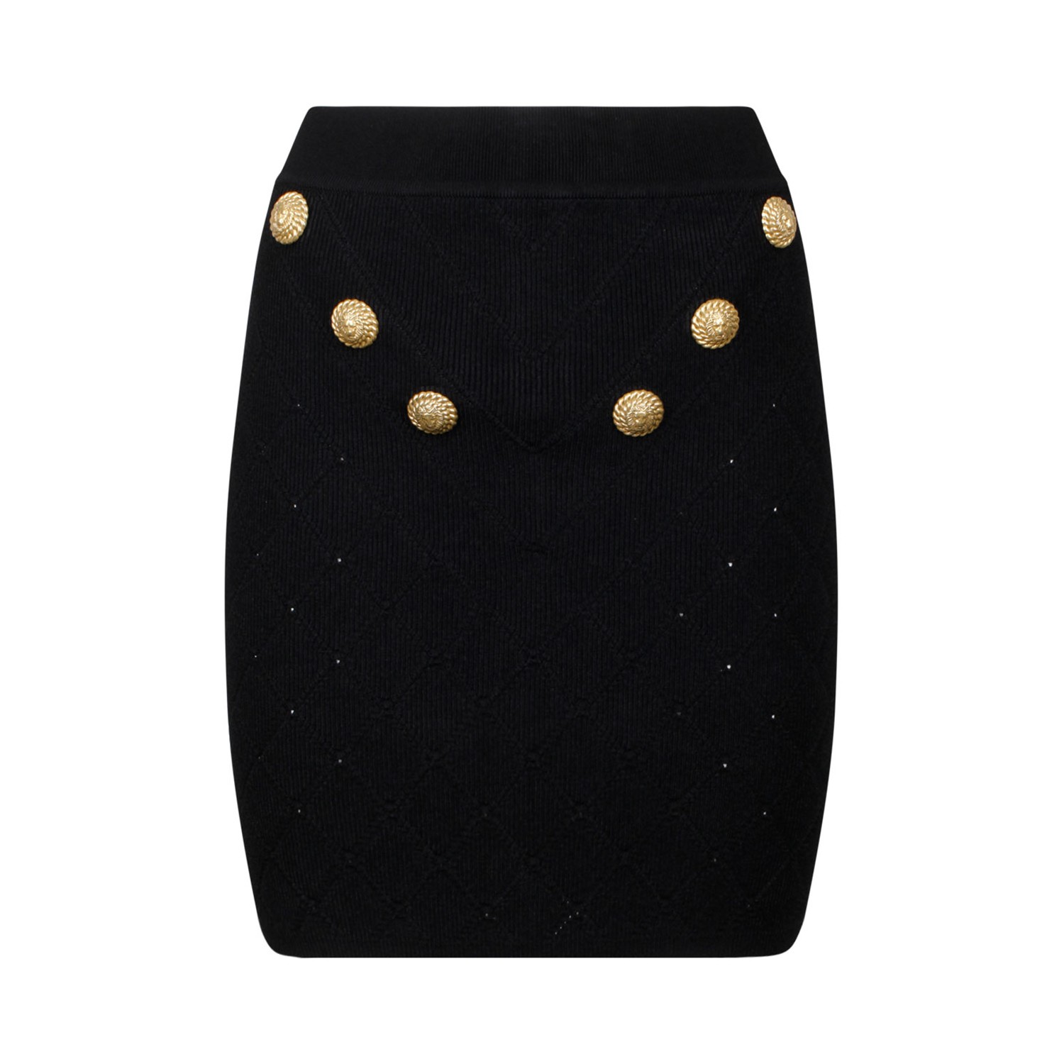 Balmain Black Fine Knit Skirt. Black fine mesh diamond pattern skirt, six " Iconic Lion " decorative in golden metal, high waist, closure on back, golden metal zip.