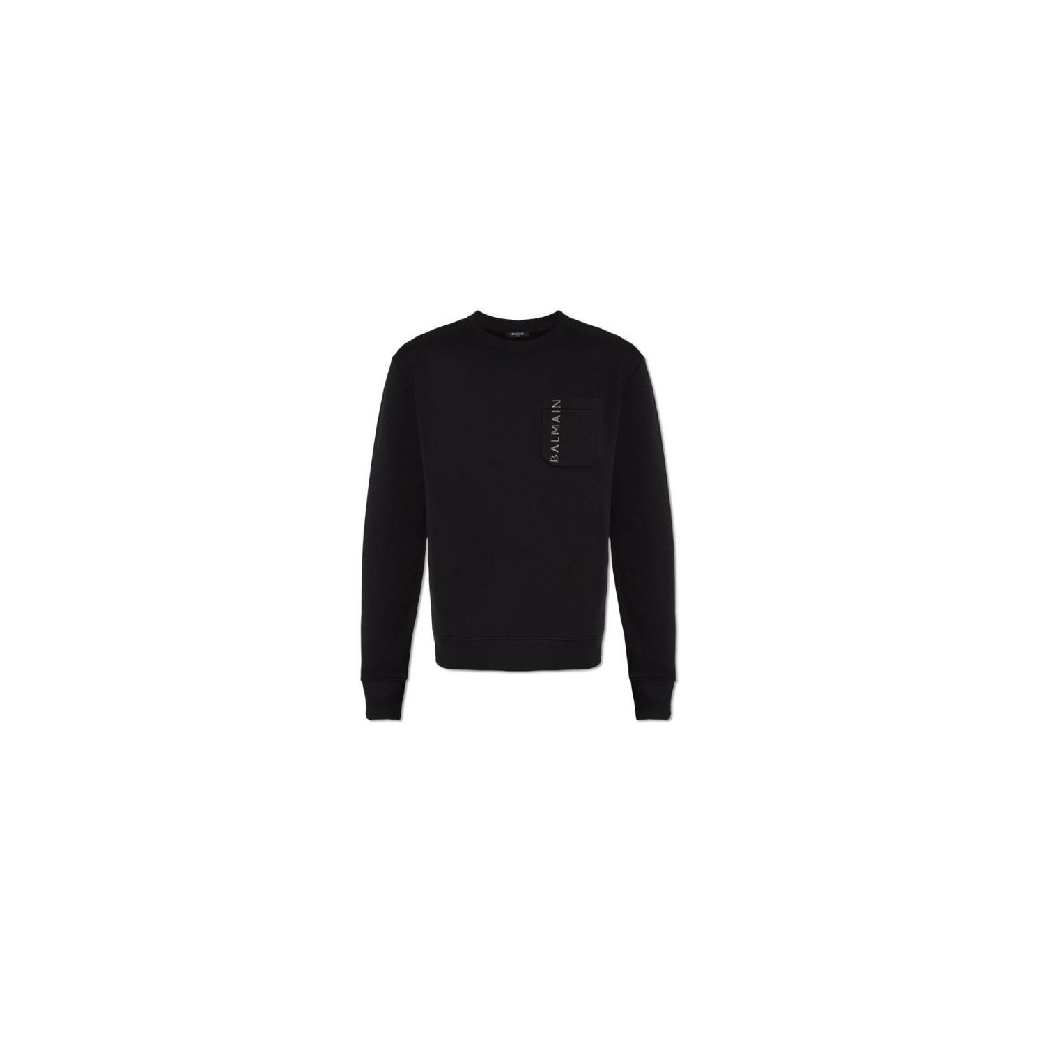 Balmain Black Embossed Logo Sweatshirt. Black cotton sweatshirt, round collar, long sleeves, elastic cuffs, embossed Balmain logo, chest pocket and straight elastic hem.
