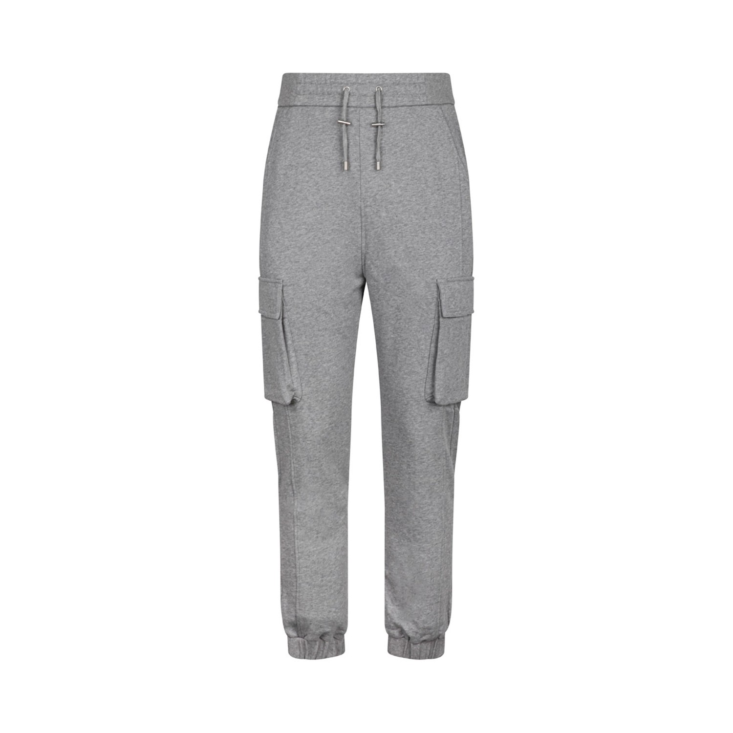 Balmain Grey Jogging Bottoms. Grey two cargo pockets jogging, contrasting Balmain Paris logo printed at the back, elastic waistband. Drawstring adjustable waist, silver metal eyelets, stoppers and aglets, ribbed trim.
