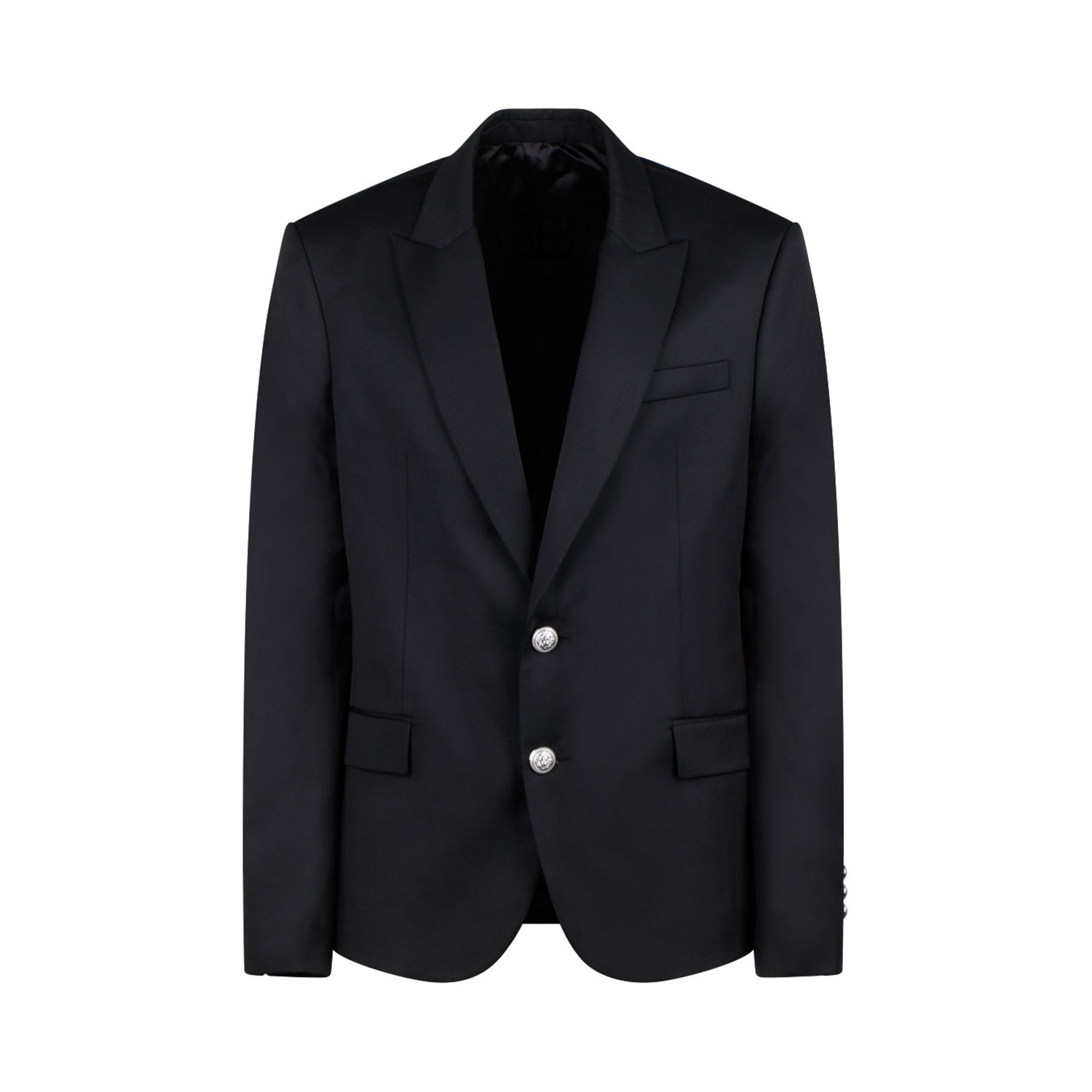 Balmain Black Two Button Jacket. Black wool jacket, tailored neckline with pointed lapels, structured shoulders, long sleeves. Double breasted front closure, two signature Lion silver metal buttons, two flap pockets, one breast pocket, tailored cuffs.