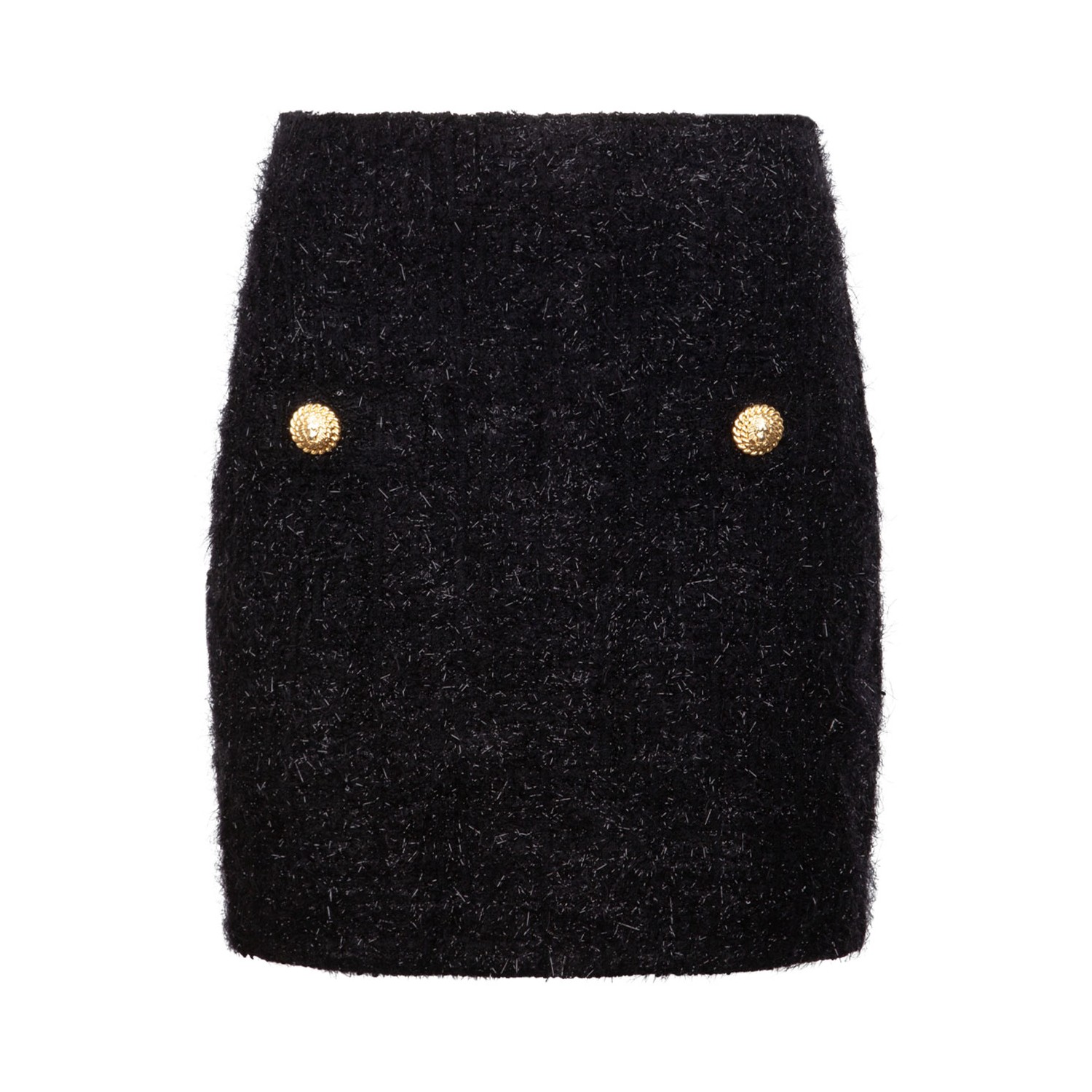 Balmain Black Tweed Mini Skirt. Black tweed mini skirt, gold metal details, two decorative buttons applied on the front. Zip fastening on the back and straight hem.