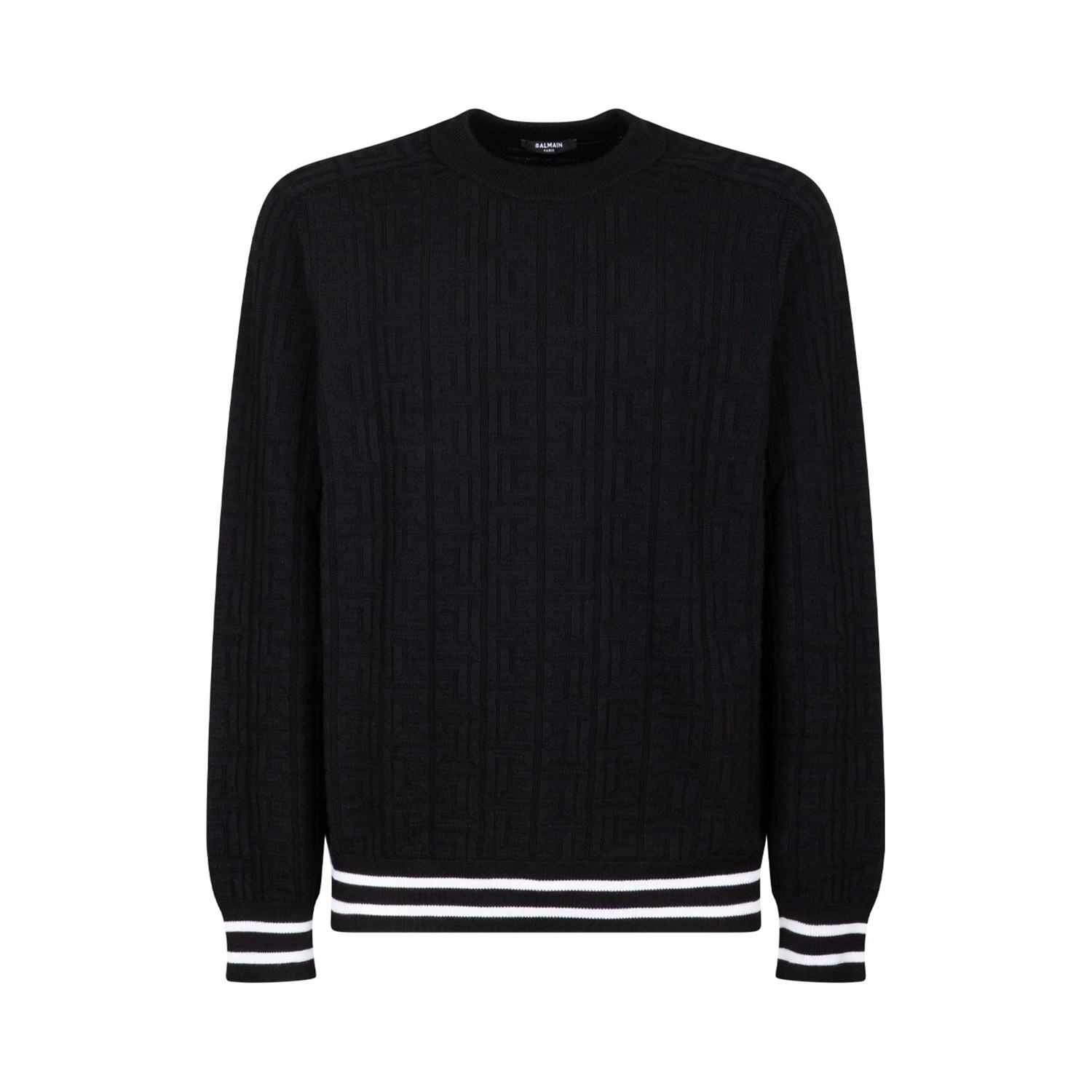 Balmain Black Patterned Jacquard Jumper. Black merino wool jumper, knitted construction, patterned jacquard, striped ribbed trim. Crew neck, long sleeves, straight hem.