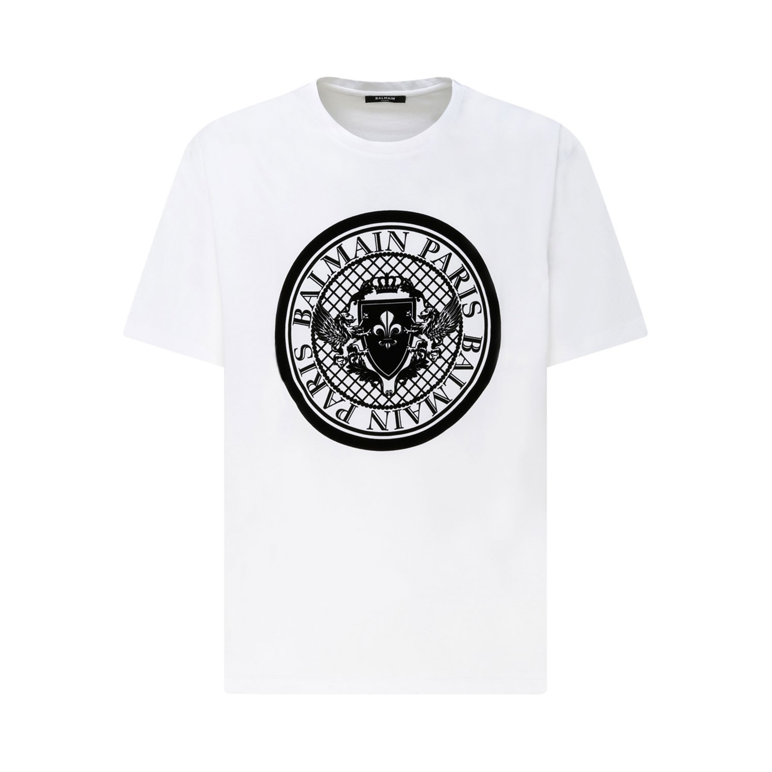 Balmain White Organic Cotton Logo Print T-Shirt. White organic cotton t-shirt, logo print to the front, graphic print to the front, round neck, short sleeves and straight hem.