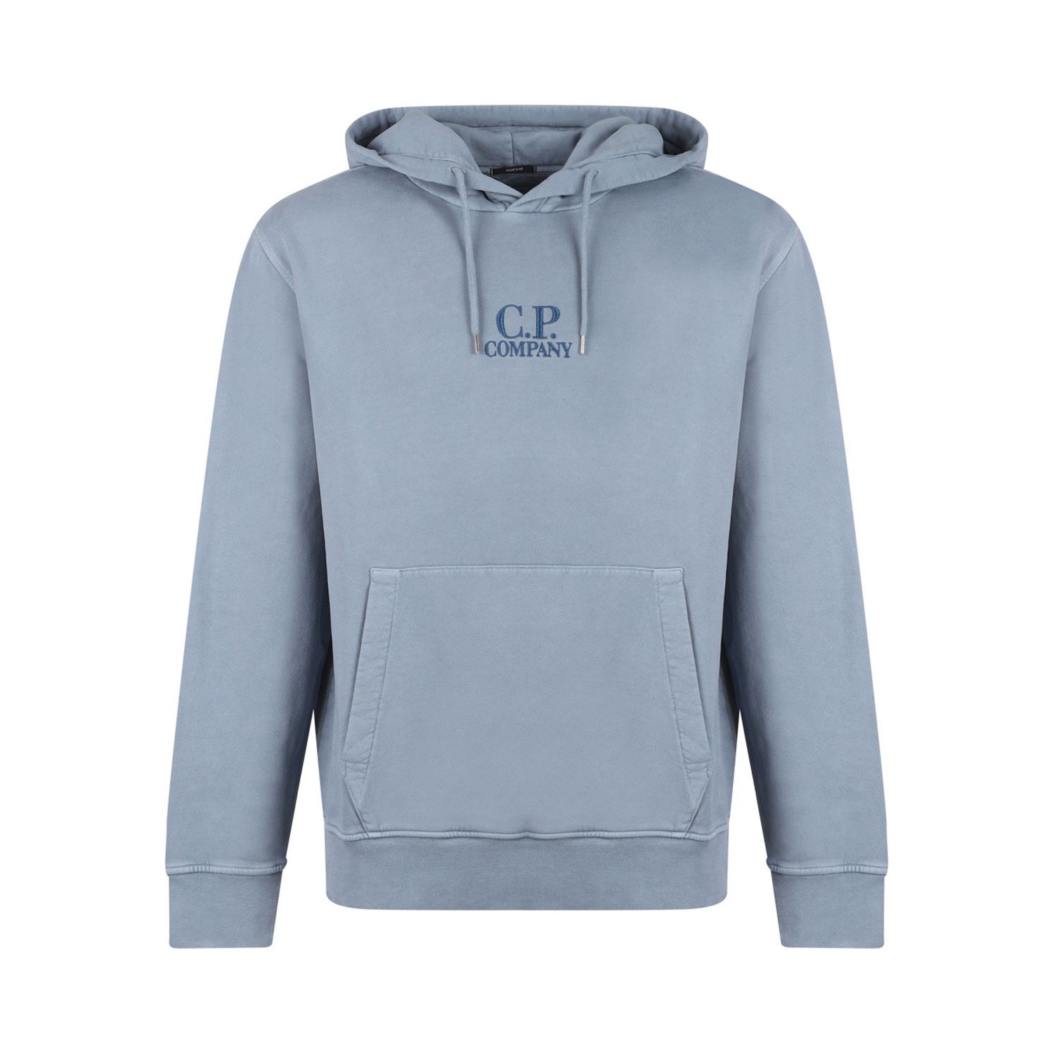 C.P. Company Light Blue Logo Embroidered Hoodie. Light blue cotton hoodie, jersey texture, embroidered logo to the front, drawstring hood. Drop shoulder, long sleeves, ribbed cuffs and hem. Front pouch pocket, fleece lining, straight hem.