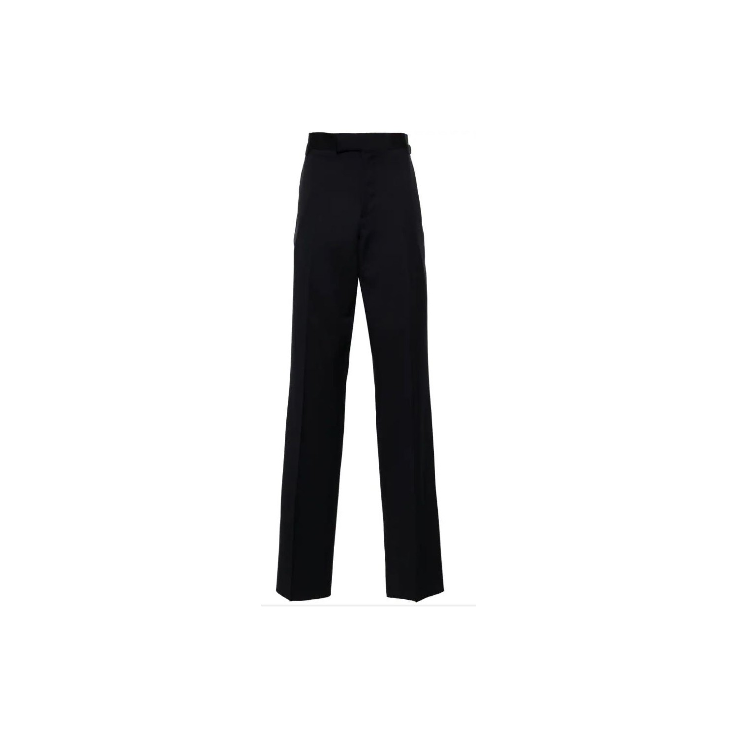 Vivienne Westwood Navy Blue Sang Trousers. Navy blue trousers with a straight leg and a centre crease. Adjustment ties at the hips, tone on tone stitching. Button and zip fastening.