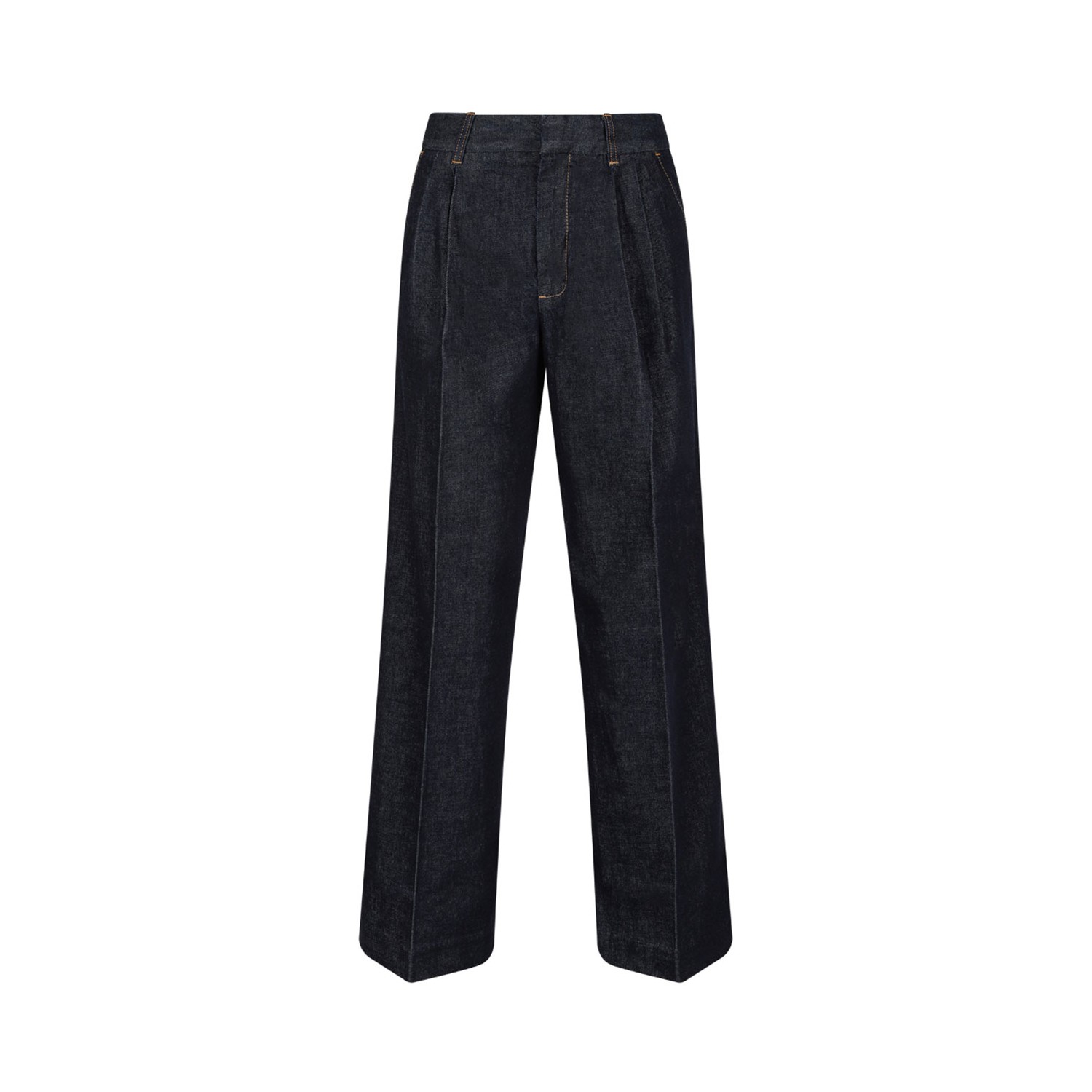 Zimmermann Illustration Denim Jeans. Navy blue denim jeans, concealed front button, hook and zip fastening, contrast stitching. Belt loops, two side slash pockets, front pleat detailing, logo tag to the back. Two rear welt pockets, full-length.