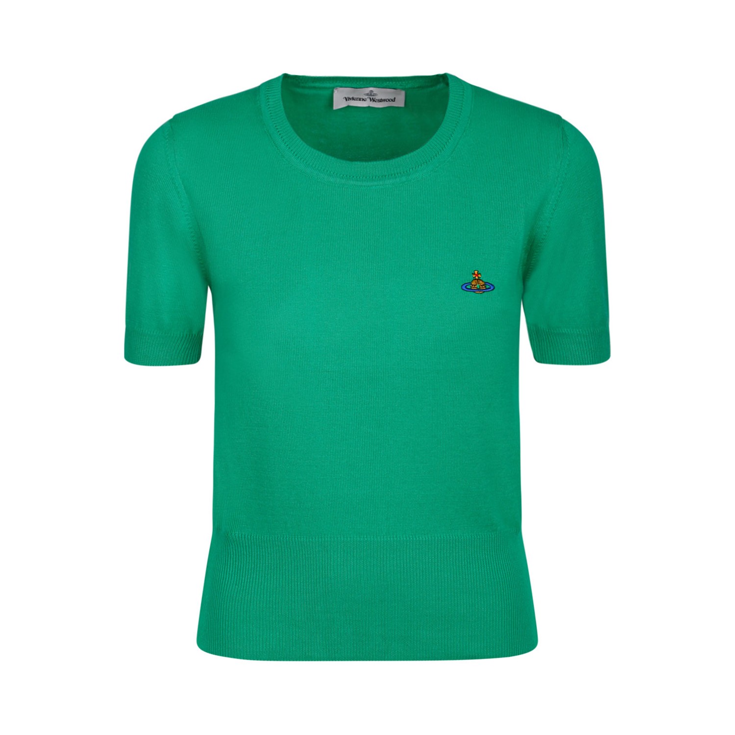 Vivienne Westwood Bea Green Top with short sleeves with ribbed bottom handle and neck, colorful brand logo detail on front.