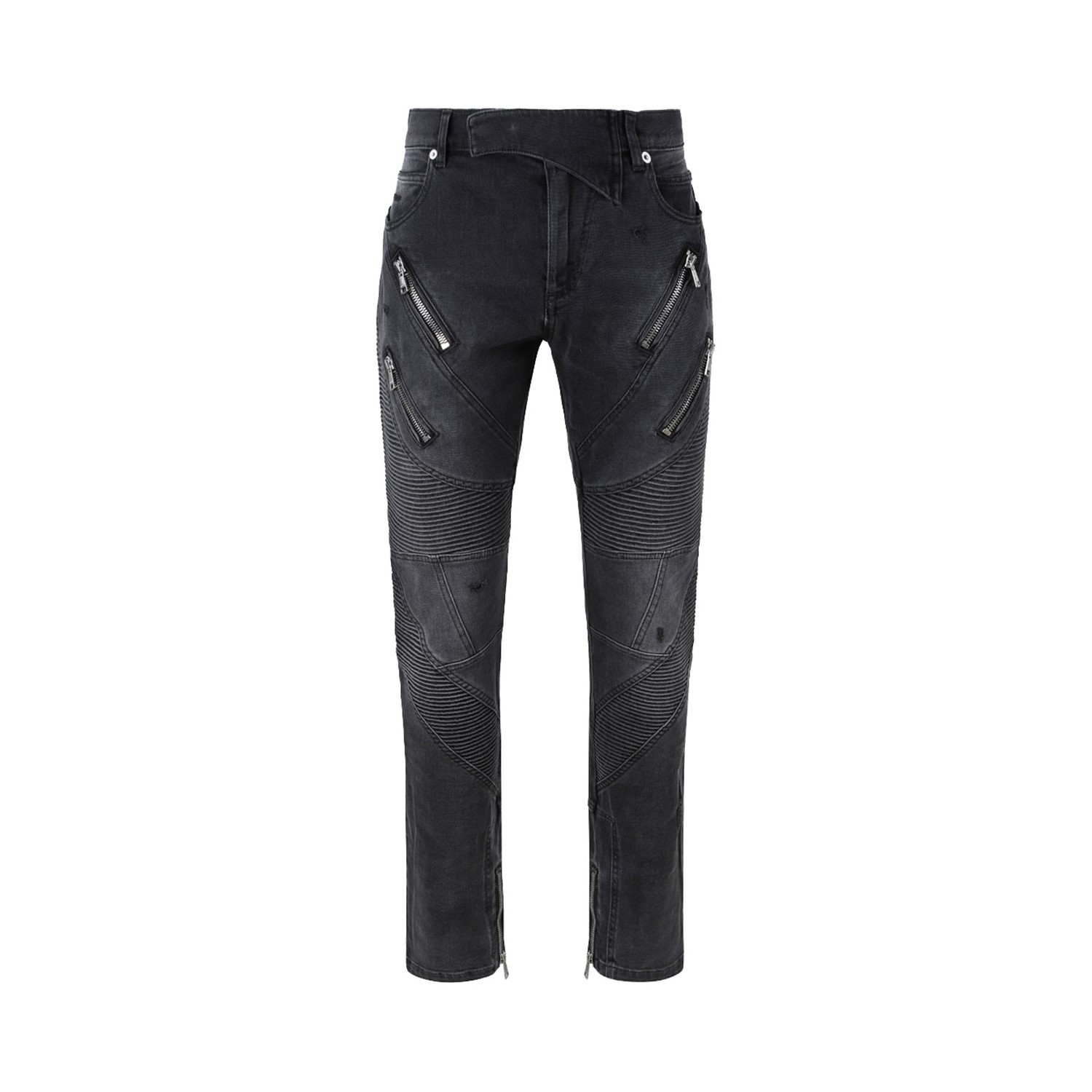 Balmain Anthracite Grey Skinny Jeans. Anthracite grey stretch cotton skinny jeans, panelled design, distressed effect, applique logo. Low rise, belt loops, off centre front button fastening, front zip fastening pockets.