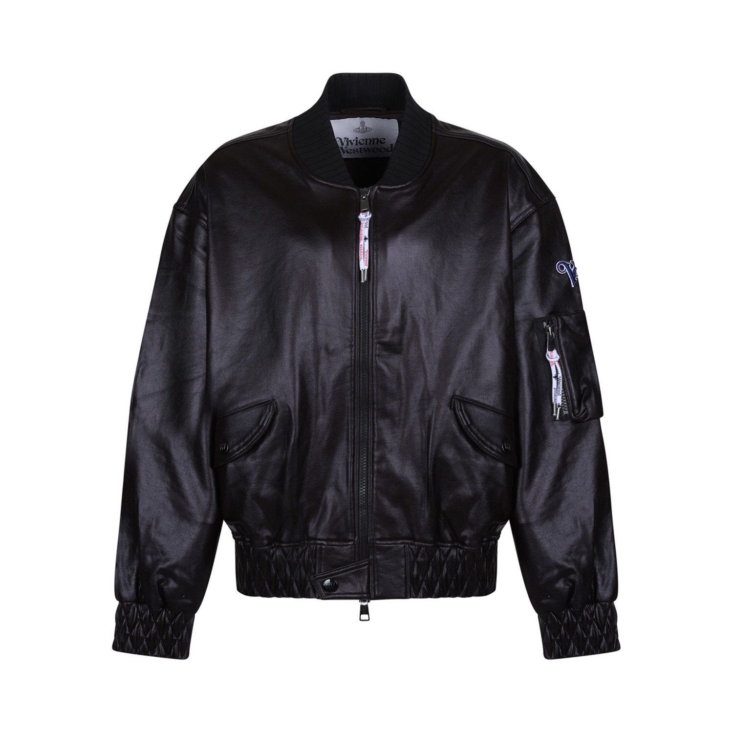 Vivienne Westwood Black Bernardo Bomber Jacket. Black organic cotton bomber jacket, coated finish, front two way zip fastening, baseball collar. Drop shoulder, long sleeves, embroidered logo at the sleeve, sleeve zip pocket. Elasticated cuffs, two front flap pockets, cotton lining, elasticated hem.