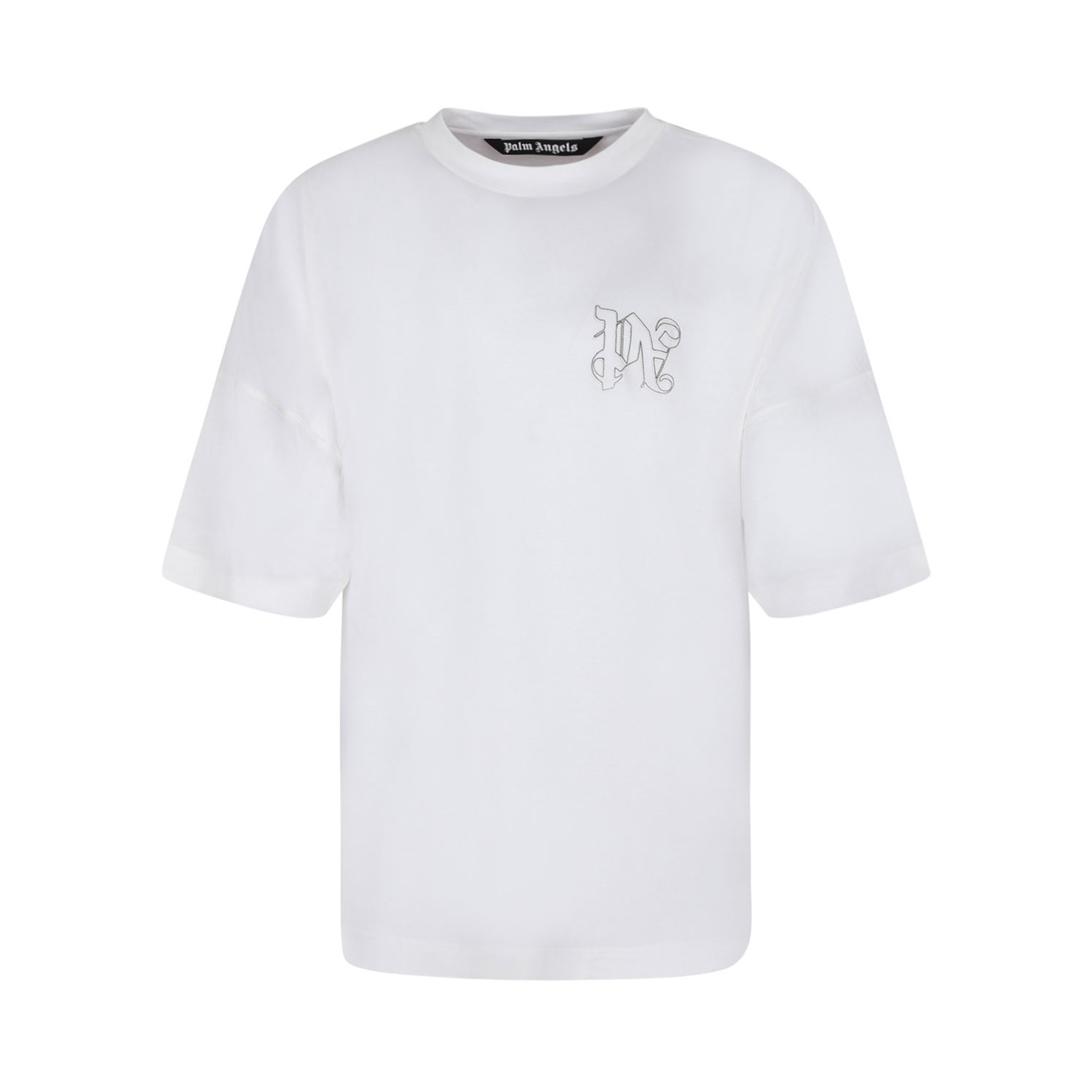 Palm Angels White PA Monogram T-Shirt. White cotton t-shirt, jersey texture, embroidered logo at the chest, embroidered logo to the rear. Crew neck, drop shoulder, short sleeves, curved hem.