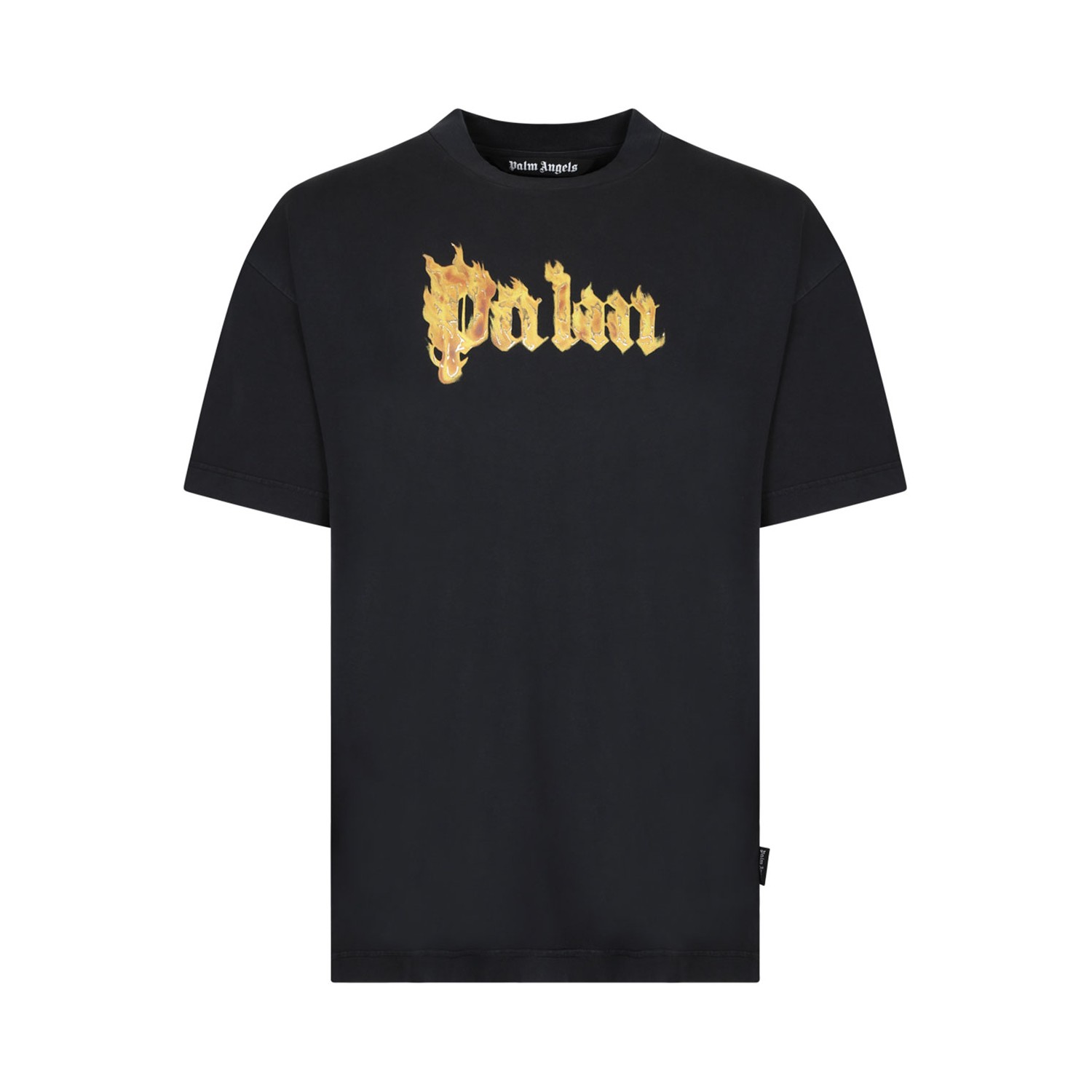 Palm Angels Black Logo Print T-Shirt. Black cotton t-shirt, jersey texture, logo print to the front and rear. Crew neck, drop shoulder, short sleeves, straight hem.